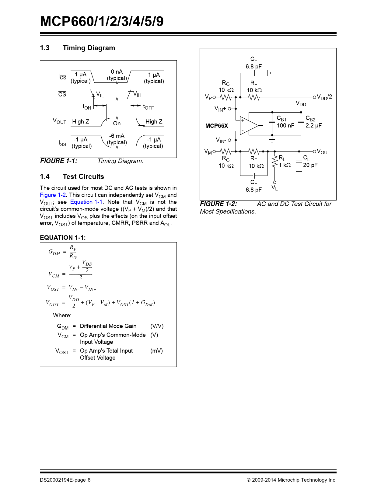 MCP660/1/2/3/4/5/9. 1.3. Timing Diagram. MCP66X. FIGURE 1-1:. 1.4. Test Circuits. FIGURE 1-2:. EQUATION 1-1: