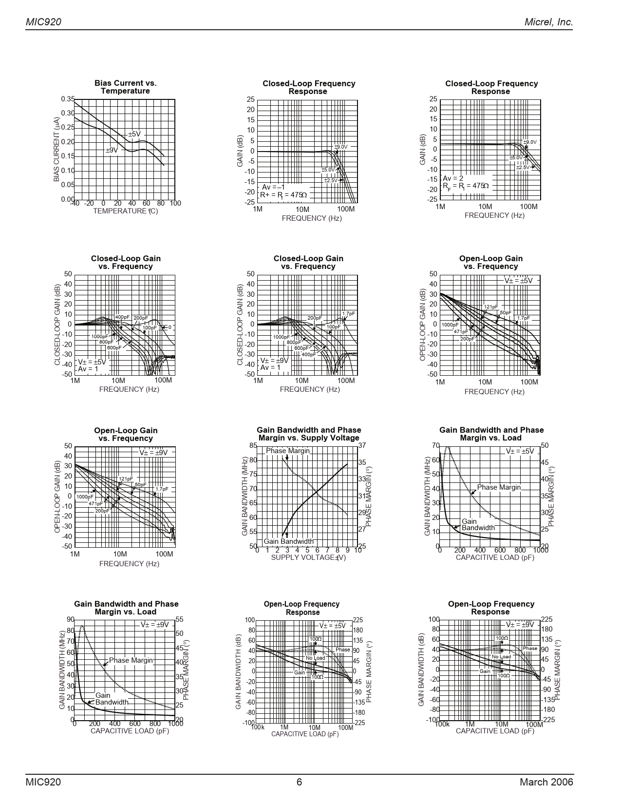 MIC920 Micrel, Inc. Bias Current vs.Closed-Loop FrequencyClosed-Loop FrequencyTemperatureResponseResponse 0.35 25 25 20 0.30 20 )A 15 15 (µ 0.25 10 T 10 ±5V ) N ) B E 0.20 5 B d 5 d ±9.0V R ( ±9.0V ( R ±9V N 0 N 0 U 0.15 I I A C -5 A -5 ±5.0V G G S 0.10 ±2.5V A -10 ±5.0V -10 IB -15 ±2.5V -15 Av = 2 0.05 R = R -20 Av =–1 -20 F I = 475Ω R+ = R 0.00 -40 -20 0 20 40 60 80 100 -25 I = 475Ω -25 1E+6 1E+6 1M 10E+6 10M 100E+6 200E+6 TEMPERATURE (°C) 1M 10E+6 10M 100E+6 200E+6 100M 100M FREQUENCY (Hz) FREQUENCY (Hz) Closed-Loop GainClosed-Loop GainOpen-Loop Gainvs. Frequencyvs. Frequencyvs. Frequency 50 50 50 ) 40 ) 40 V± = ±5V B B 40 d ) ( 30 d( 30 B 30 d IN ( 20 IN 20 A A N 20 I 121pF G 10 G A 50pF 400pF 10 1.7pF 10 P 200pF P 200pF G 1.7pF O 0 O 0 P 0 1000pF O 100pF 0 O 100pF L O - -10 L 471pF 1000pF - -10 O -10 D L 800pF D 1000pF - 200pF E -20 E -20 800pF N -20 S 600pF S 600pF E O -30 O -30 L L 400pF P -30 C O -40 V± = ±5V C -40 V± = ±9V Av = 1 Av = 1 -40 -50 -50 -50 1E+6 1M 10E+6 10M 100E+6 200E+6 100M 1E+6 1M 1E+7 10M 1E+82E+8 100M 1x106 1M 10x106 10M 100x106 200x106 100M FREQUENCY (Hz) FREQUENCY (Hz) FREQUENCY (Hz) Open-Loop GainGain Bandwidth and PhaseGain Bandwidth and Phasevs. FrequencyMargin vs. Supply VoltageMargin vs. Load 50 85 37 70 50 Phase Margin V± = ±9V V± = ±5V 40 ) z 80 )z 60 B 30 H 35 H 45 d( M( °) °) N 20 75 ( M( 50 ( I 121pF H IN N A 50pF T 33 H 40 I 10 G T G G 1.7pF ID 70 R ID 40 Phase Margin R P 0 1000pF W 31 A W 35 A O 471pF D 65 M D M O -10 N E 30 E L- 200pF A S N S N -20 B 29 A 30 60 A B A E N 20 P I H N Gain H -30 A P IA P Bandwidth O G 55 27 G 10 25 -40 Gain Bandwidth -50 50 25 0 1 2 3 4 5 6 7 8 9 10 0 20 0 200 400 600 800 1000 1x106 1M 10x106 10M 100x106 200x106 100M SUPPLY VOLTAGE (±V) CAPACITIVE LOAD (pF) FREQUENCY (Hz) Gain Bandwidth and PhaseOpen-Loop FrequencyOpen-Loop FrequencyMargin vs. LoadResponseResponse 90 55 100 225 100 225 V± = ±9V V± = ±9V ) 80 V± = ±5V z 50 80 180 80 ) 180 H ) 70 B 100Ω B 60 100Ω 135 M 60 135 d ( °) d °) 45 ( (°) ( H 60 N H 40 Phase 90 H 40 Phase 90 N T I T NI T I No Load D G No Load G I 50 Phase Margin 40 R D 20 I 45 G DI 20 45 R R W A W A W 0 Gain 0 A D 40 M 0 D Gain 0 D 100Ω M N 35 E N 100Ω M N -20 -45 E A 30 S -20 A -45 E A S B B 30 A B S -40 -90 A -40 -90 A IN 20 H Gain N H NI H A P I Bandwidth A P -60 -135 P A -60 -135 G 10 25 G G -80 -180 -80 -180 0 20 0 200 400 600 800 1000 -100 -225 -100 -225 100k 1M 10M 100M CAPACITIVE LOAD (pF) 100k 1M 10M 100M CAPACITIVE LOAD (pF) CAPACITIVE LOAD (pF) MIC920 6 March 2006