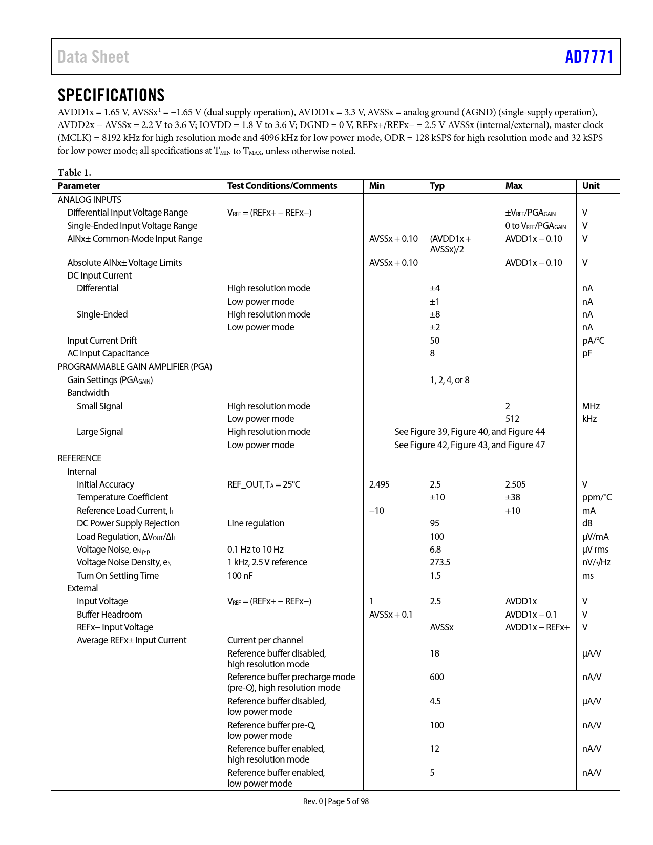 Data Sheet. AD7771. SPECIFICATIONS. Table 1. Parameter. Test Conditions/Comments. Min. Typ. Max. Unit