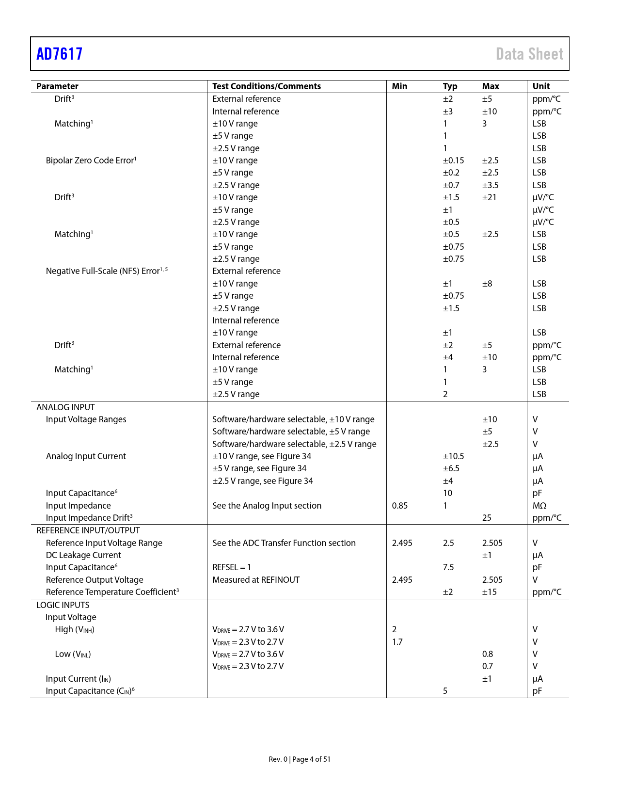 Pages / Page52 / 5 — AD7617. Data Sheet. Parameter. Test Conditions/Comments. Min. Typ. Max. …