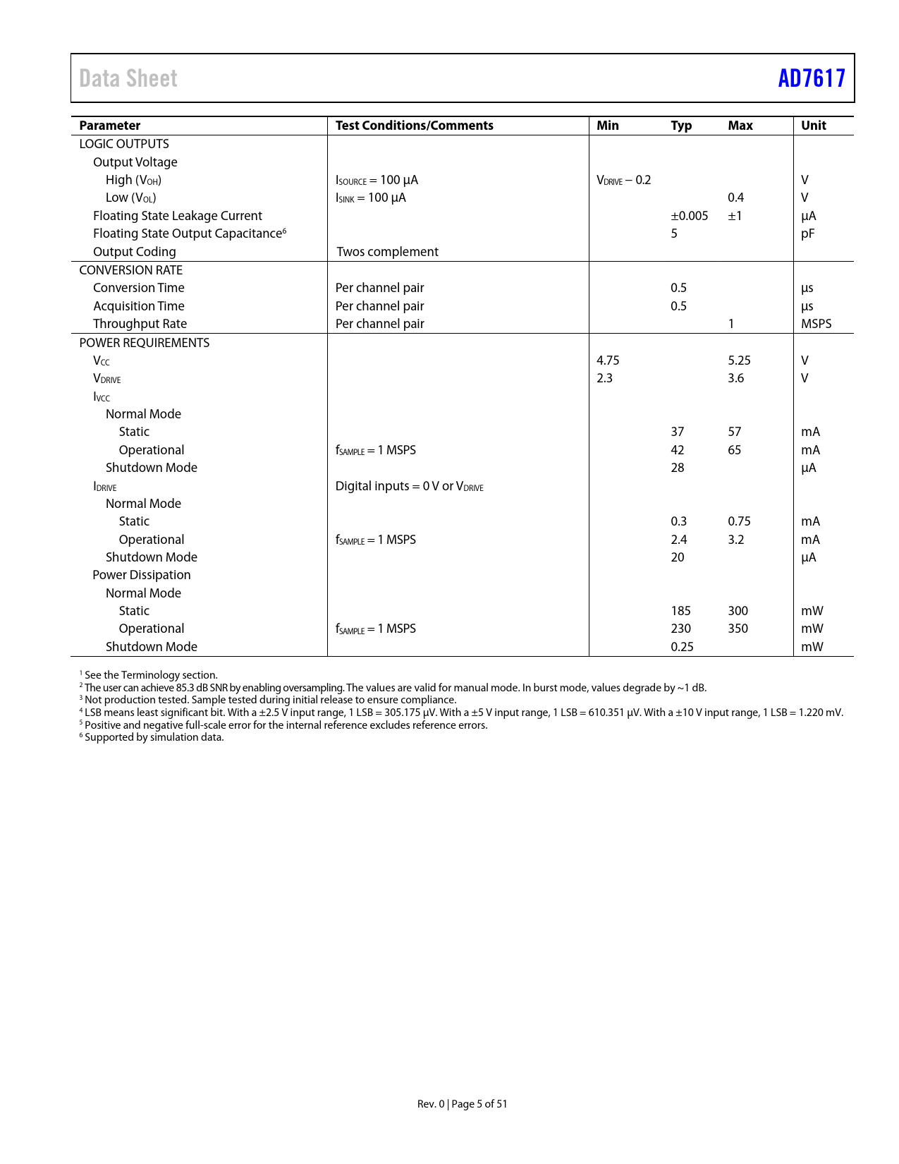 Pages / Page52 / 6 — Data Sheet. AD7617. Parameter. Test Conditions/Comments. Min. Typ. Max. …