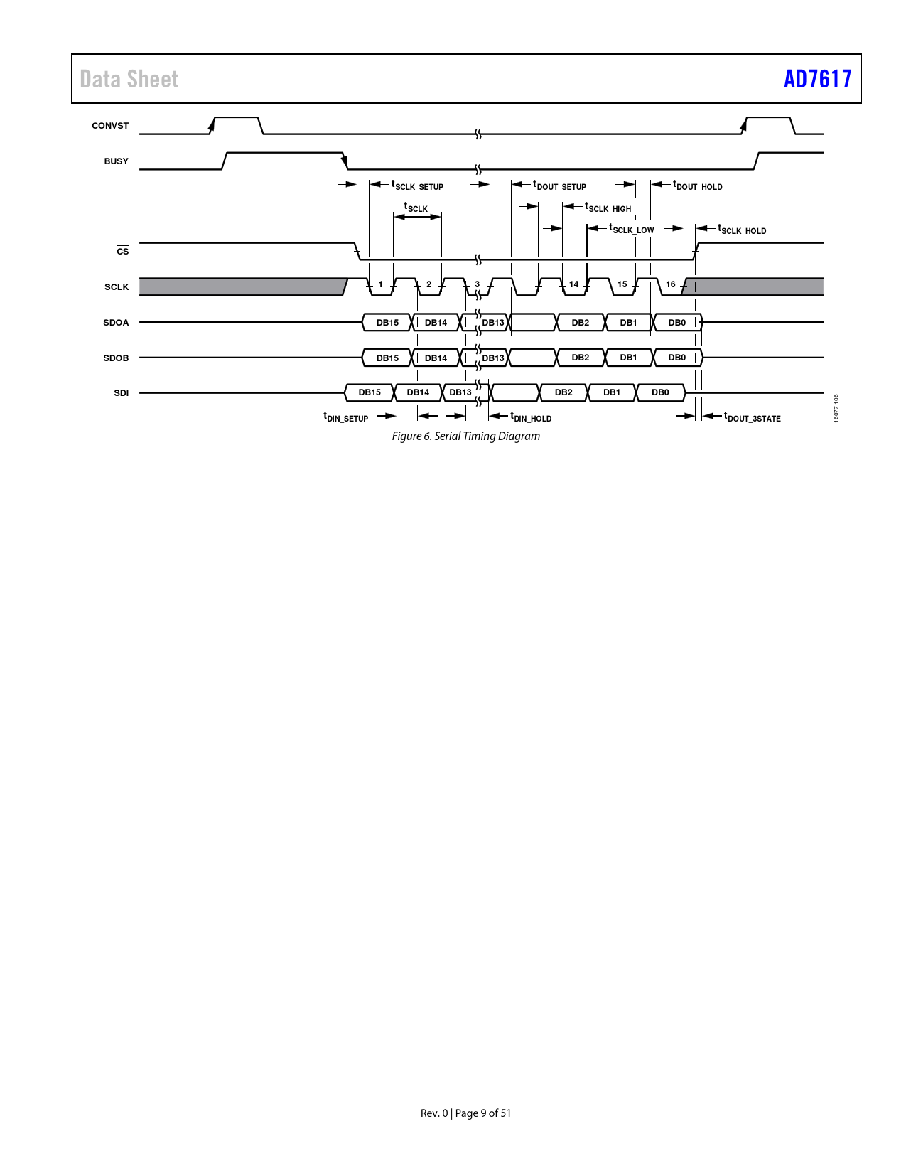Data Sheet AD7617 CONVST BUSY t t t SCLK_SETUP DOUT_SETUP DOUT_HOLD t t SCLK SCLK_HIGH tSCLK_LOW tSCLK_HOLD CS 1 2 3 14 15 16 SCLK SDOA DB15 DB14 DB13 DB2 DB1 DB0 SDOB DB15 DB14 DB13 DB2 DB1 DB0 SDI DB15 DB14 DB13 DB2 DB1 DB0