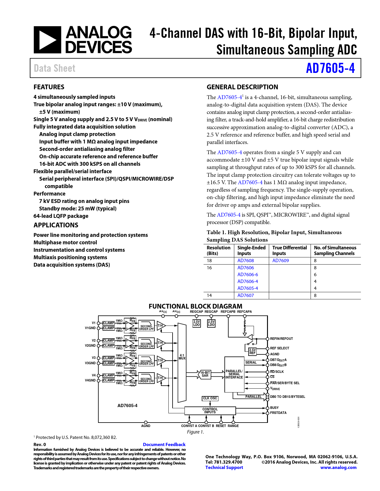 4-Channel DAS with 16-Bit, Bipolar Input,. Simultaneous Sampling ADC. Data Sheet. AD7605-4. FEATURES. GENERAL DESCRIPTION