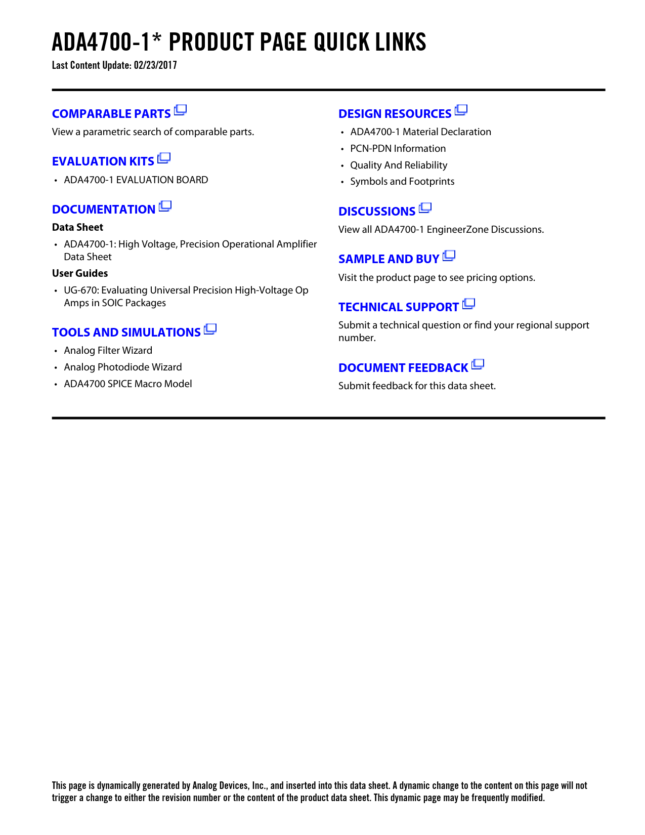 ADA4700-1* PRODUCT PAGE QUICK LINKS Last Content Update: 02/23/2017 COMPARABLE PARTS DESIGN RESOURCES