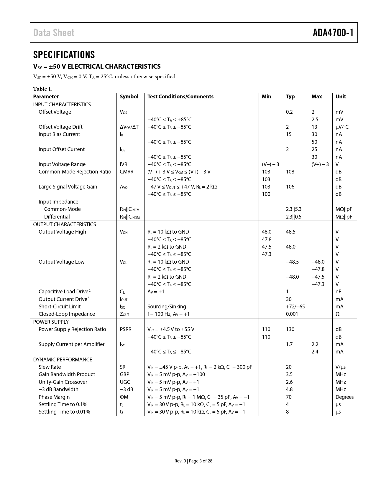 Data Sheet. ADA4700-1. SPECIFICATIONS VSY = ±50 V ELECTRICAL CHARACTERISTICS. Table 1. Parameter. Symbol