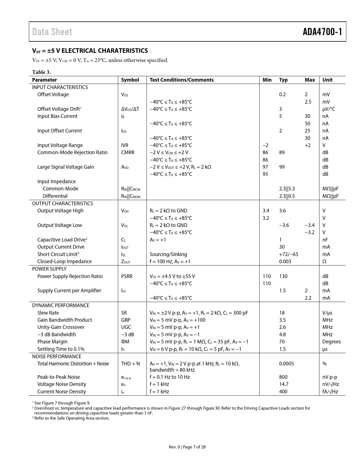 Data Sheet. ADA4700-1. VSY = ±5 V ELECTRICAL CHARATERISTICS. Table 3. Parameter Symbol. Test. Conditions/Comments. Min. Typ. Max. Unit