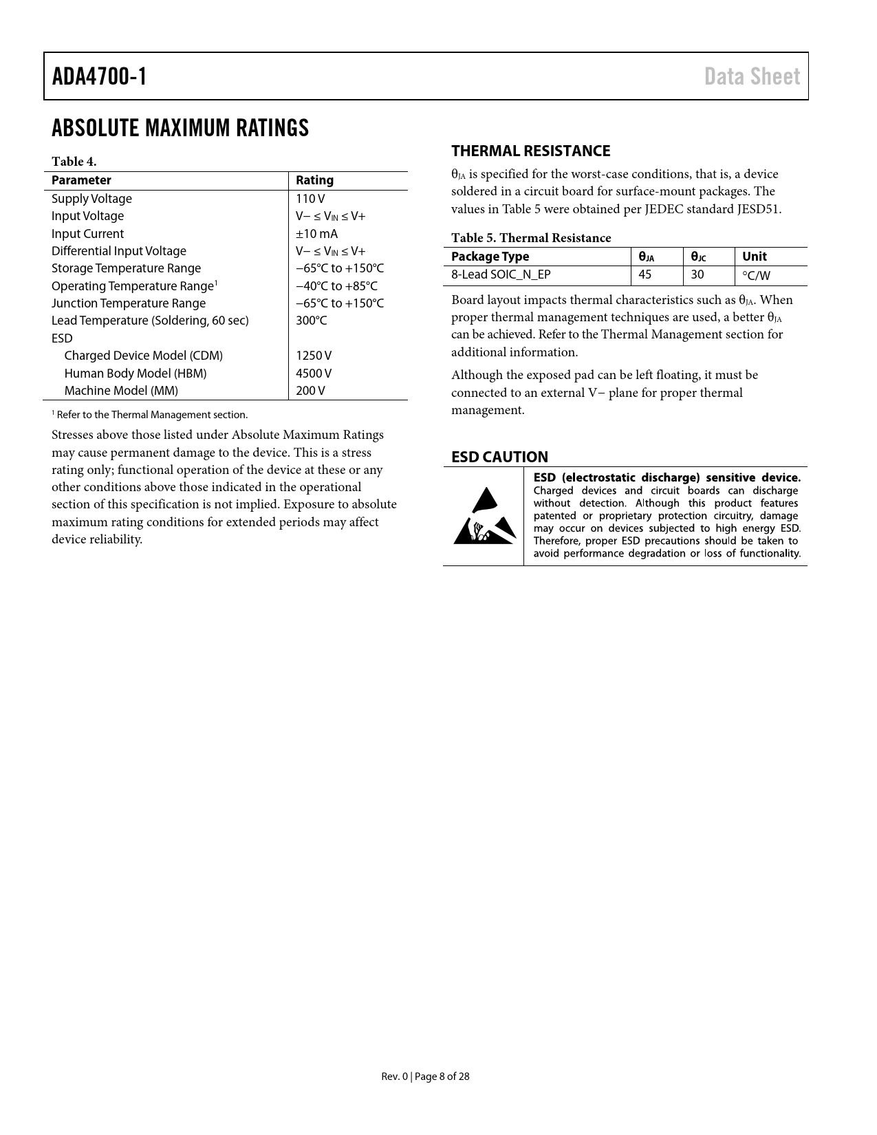 ADA4700-1. Data Sheet. ABSOLUTE MAXIMUM RATINGS. THERMAL RESISTANCE. Table 4. Parameter. Rating. Table 5. Thermal Resistance