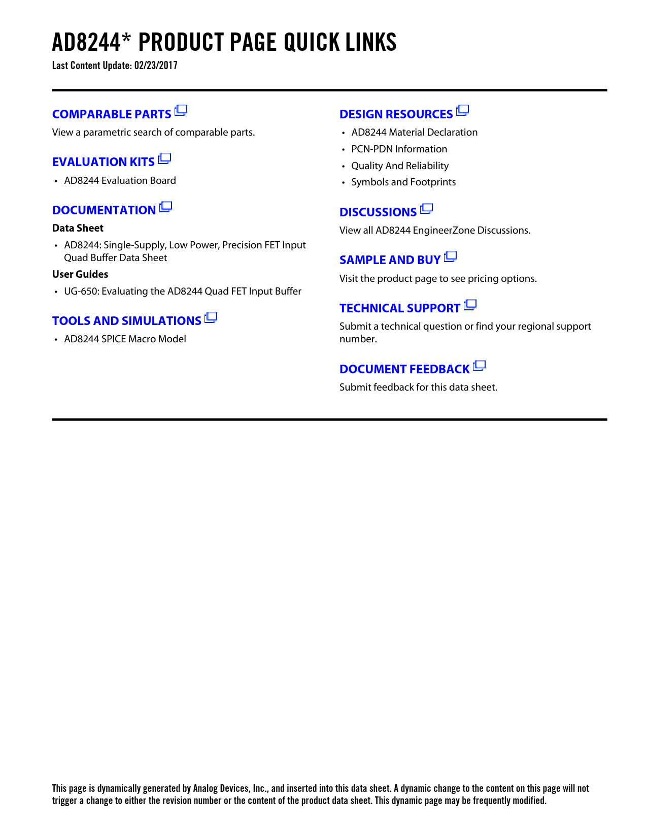 AD8244* PRODUCT PAGE QUICK LINKS Last Content Update: 02/23/2017COMPARABLE PARTSDESIGN RESOURCES View a parametric search of comparable parts. • AD8244 Material Declaration • PCN-PDN Information EVALUATION KITS • Quality And Reliability • AD8244 Evaluation Board • Symbols and Footprints DOCUMENTATIONDISCUSSIONSData Sheet View all AD8244 EngineerZone Discussions. • AD8244: Single-Supply, Low Power, Precision FET Input Quad Buffer Data Sheet SAMPLE AND BUYUser Guides Visit the product page to see pricing options. • UG-650: Evaluating the AD8244 Quad FET Input Buffer TECHNICAL SUPPORTTOOLS AND SIMULATIONS Submit a technical question or find your regional support • AD8244 SPICE Macro Model number. DOCUMENT FEEDBACK Submit feedback for this data sheet. This page is dynamically generated by Analog Devices, Inc., and inserted into this data sheet. A dynamic change to the content on this page will not trigger a change to either the revision number or the content of the product data sheet. This dynamic page may be frequently modified. Document Outline FEATURES APPLICATIONS PIN CONFIGURATION GENERAL DESCRIPTION TABLE OF CONTENTS REVISION HISTORY SPECIFICATIONS ABSOLUTE MAXIMUM RATINGS THERMAL RESISTANCE ESD CAUTION PIN CONFIGURATION AND FUNCTION DESCRIPTIONS TYPICAL PERFORMANCE CHARACTERISTICS THEORY OF OPERATION OVERVIEW GUARDING INPUT PROTECTION LAYOUT CONSIDERATIONS DIFFERENTIAL SIGNAL CHAINS LOW OUTPUT IMPEDANCE vs. FREQUENCY APPLICATIONS INFORMATION ELECTROCARDIOGRAM (ECG) FILTERING Sallen-Key Low-Pass Filter Sallen-Key High-Pass Filter Twin-T Notch Filter PHOTODIODE AMPLIFIER LOW NOISE, JFET INPUT BUFFER OUTLINE DIMENSIONS ORDERING GUIDE