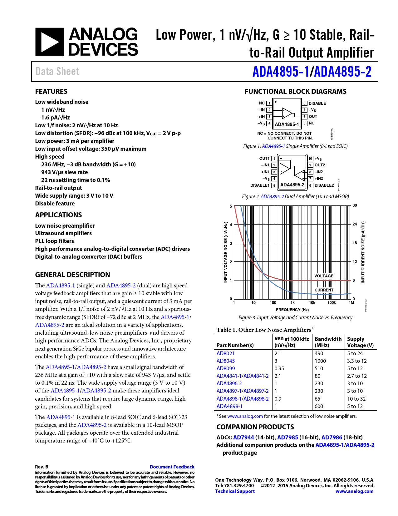 Low Power, 1 nV/√Hz, G ≥ 10 Stable, Rail-. to-Rail Output Amplifier. Data Sheet. ADA4895-1/. ADA4895-2. FEATURES
