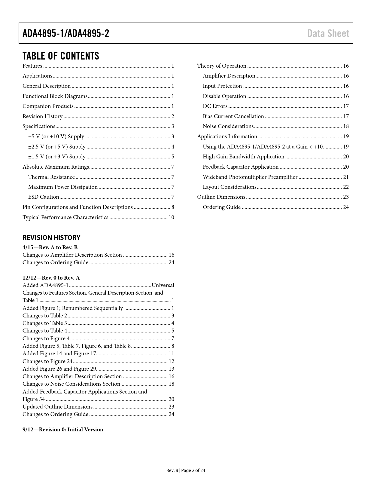 Pages / Page24 / 2 — ADA4895-1/ADA4895-2. Data Sheet. TABLE OF CONTENTS. REVISION HISTORY …