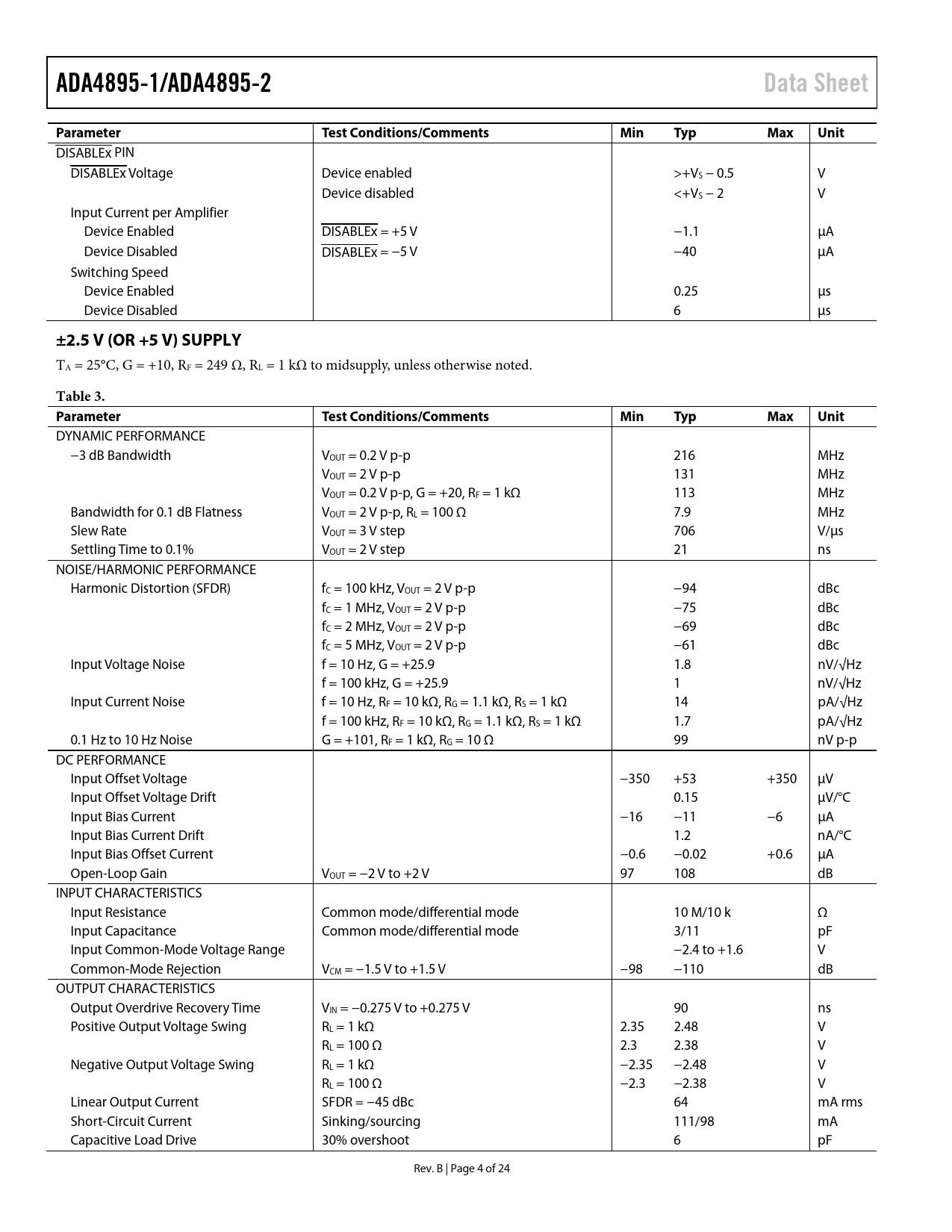 | Pages / Page | 24 / 4 — ADA4895-1/ADA4895-2. Data Sheet. Parameter. Test Conditions/Comments. … |