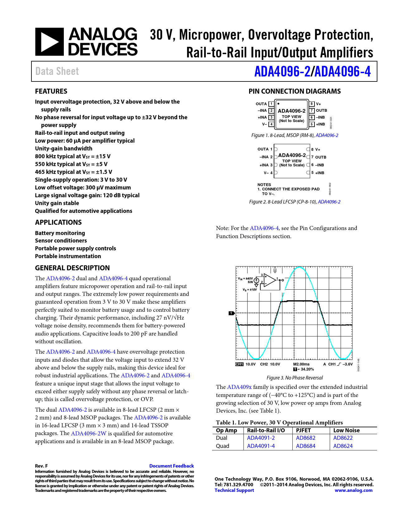 09241- robust industrial applications. The ADA4096-2 and ADA4096-4 Figure 3. No Phase Reversal feature a unique input stage that al ows the input voltage to The ADA409x family is specified over the extended industrial exceed either supply safely without any phase reversal or latch- temperature range of (−40°C to +125°C) and is part of the up; this is called overvoltage protection, or OVP. growing selection of 30 V, low power op amps from Analog The dual ADA4096-2 is available in 8-lead LFCSP (2 mm × Devices, Inc. (see Table 1). 2 mm) and 8-lead MSOP packages. The ADA4096-2 is available in 16-lead LFCSP (3 mm × 3 mm) and 14-lead TSSOP