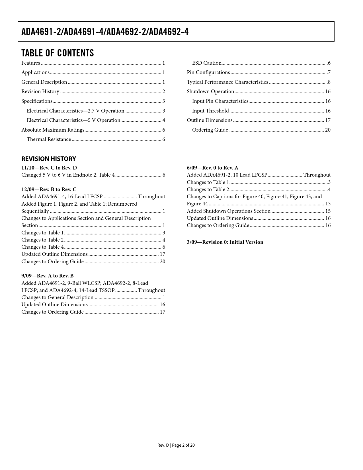Pages / Page20 / 2 — ADA4691-2/ADA4691-4/ADA4692-2/ADA4692-4. TABLE OF CONTENTS. REVISION …