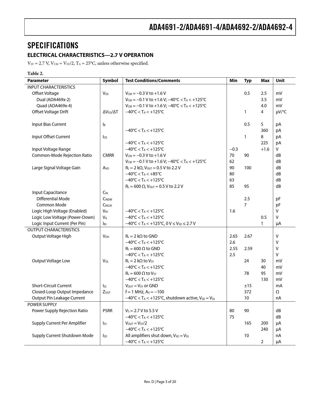 ADA4691-2/ADA4691-4/ADA4692-2/ADA4692-4SPECIFICATIONS ELECTRICAL CHARACTERISTICS—2.7 V OPERATION VSY = 2.7 V, VCM = VSY/2, TA = 25°C, unless otherwise specified. Table 2.Parameter SymbolTestConditions/CommentsMinTypMaxUnit INPUT CHARACTERISTICS Offset Voltage VOS VCM = −0.3 V to +1.6 V 0.5 2.5 mV Dual (ADA469x-2) VCM = −0.1 V to +1.6 V; −40°C < TA < +125°C 3.5 mV Quad (ADA469x-4) VCM = −0.1 V to +1.6 V; −40°C < TA < +125°C 4.0 mV Offset Voltage Drift ΔVOS/ΔT −40°C < TA < +125°C 1 4 μV/°C Input Bias Current IB 0.5 5 pA −40°C < TA < +125°C 360 pA Input Offset Current IOS 1 8 pA −40°C < TA < +125°C 225 pA Input Voltage Range −40°C < TA < +125°C −0.3 +1.6 V Common-Mode Rejection Ratio CMRR VCM = −0.3 V to +1.6 V 70 90 dB VCM = −0.1 V to +1.6 V; −40°C < TA < +125°C 62 dB Large Signal Voltage Gain AVO RL = 2 kΩ, VOUT = 0.5 V to 2.2 V 90 100 dB −40°C < TA < +85°C 80 dB −40°C < TA < +125°C 63 dB RL = 600 Ω, VOUT = 0.5 V to 2.2 V 85 95 dB Input Capacitance CIN Differential Mode CINDM 2.5 pF Common Mode CINCM 7 pF Logic High Voltage (Enabled) VIH −40°C < TA < +125°C 1.6 V Logic Low Voltage (Power-Down) VIL −40°C < TA < +125°C 0.5 V Logic Input Current (Per Pin) IIN −40°C < TA < +125°C, 0 V ≤ VSD ≤ 2.7 V 1 μA OUTPUT CHARACTERISTICS Output Voltage High VOH RL = 2 kΩ to GND 2.65 2.67 V −40°C < TA < +125°C 2.6 V RL = 600 Ω to GND 2.55 2.59 V −40°C < TA < +125°C 2.5 V Output Voltage Low VOL RL = 2 kΩ to VSY 24 30 mV −40°C < TA < +125°C 40 mV RL = 600 Ω to VSY 78 95 mV −40°C < TA < +125°C 130 mV Short-Circuit Current ISC VOUT = VSY or GND ±15 mA Closed-Loop Output Impedance ZOUT f = 1 MHz, AV = −100 372 Ω Output Pin Leakage Current −40°C < TA < +125°C, shutdown active, VSD = VSS 10 nA POWER SUPPLY Power Supply Rejection Ratio PSRR VS = 2.7 V to 5.5 V 80 90 dB −40°C < TA < +125°C 75 dB Supply Current Per Amplifier ISY VOUT = VSY/2 165 200 μA −40°C < TA < +125°C 240 μA Supply Current Shutdown Mode ISD All amplifiers shut down, VSD = VSS 10 nA −40°C < TA < +125°C 2 μA Rev. D | Page 3 of 20 Document Outline FEATURES APPLICATIONS GENERAL DESCRIPTION TABLE OF CONTENTS REVISION HISTORY SPECIFICATIONS ELECTRICAL CHARACTERISTICS—2.7 V OPERATION ELECTRICAL CHARACTERISTICS—5 V OPERATION ABSOLUTE MAXIMUM RATINGS THERMAL RESISTANCE ESD CAUTION PIN CONFIGURATIONS TYPICAL PERFORMANCE CHARACTERISTICS SHUTDOWN OPERATION INPUT PIN CHARACTERISTICS INPUT THRESHOLD OUTLINE DIMENSIONS ORDERING GUIDE
