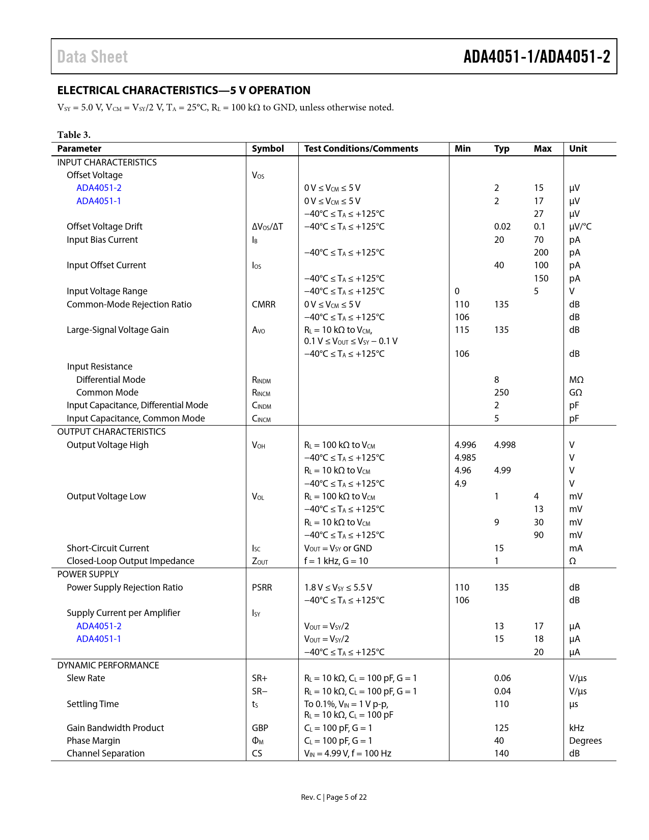 | Pages / Page | 22 / 5 — Data Sheet. ADA4051-1/ADA4051-2. ELECTRICAL CHARACTERISTICS—5 V … |