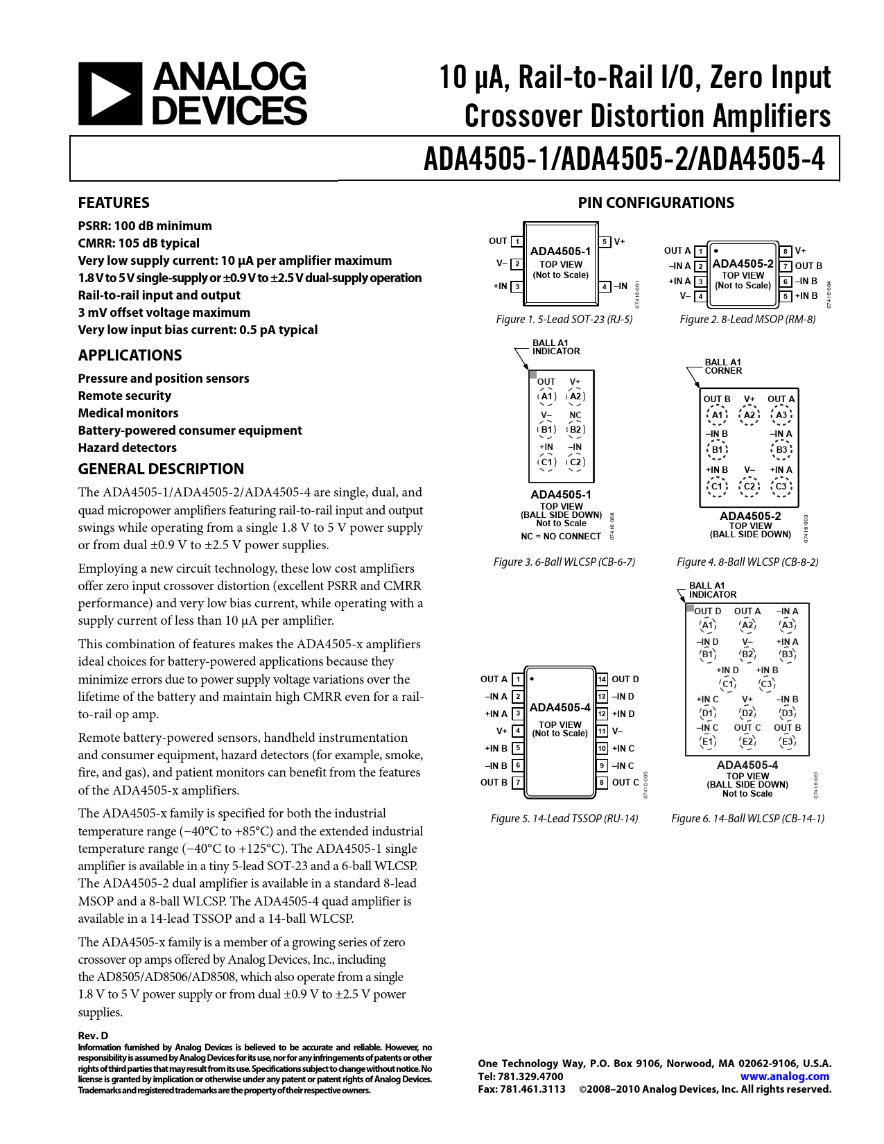 41 07 07 The ADA4505-x family is specified for both the industrial Figure 5. 14-Lead TSSOP (RU-14) Figure 6. 14-Ball WLCSP (CB-14-1) temperature range (−40°C to +85°C) and the extended industrial temperature range (−40°C to +125°C). The ADA4505-1 single amplifier is available in a tiny 5-lead SOT-23 and a 6-ball WLCSP. The ADA4505-2 dual amplifier is available in a standard 8-lead MSOP and a 8-ball WLCSP. The ADA4505-4 quad amplifier is available in a 14-lead TSSOP and a 14-ball WLCSP. The ADA4505-x family is a member of a growing series of zero crossover op amps offered by Analog Devices, Inc., including the AD8505/AD8506/AD8508, which also operate from a single 1.8 V to 5 V power supply or from dual ±0.9 V to ±2.5 V power supplies.
