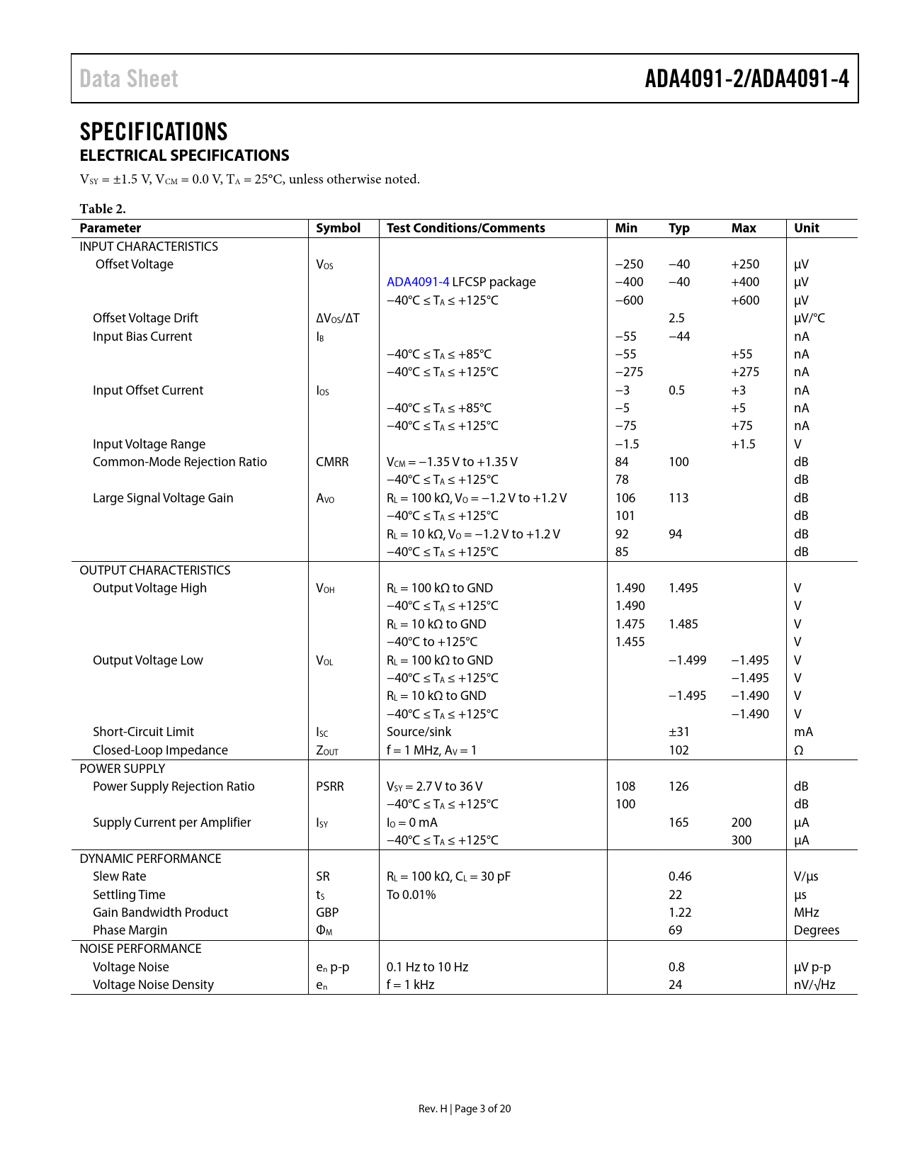 Data Sheet ADA4091-2/ADA4091-4 SPECIFICATIONS ELECTRICAL SPECIFICATIONS Table 2 Parameter Symbol Test Conditions/Comments