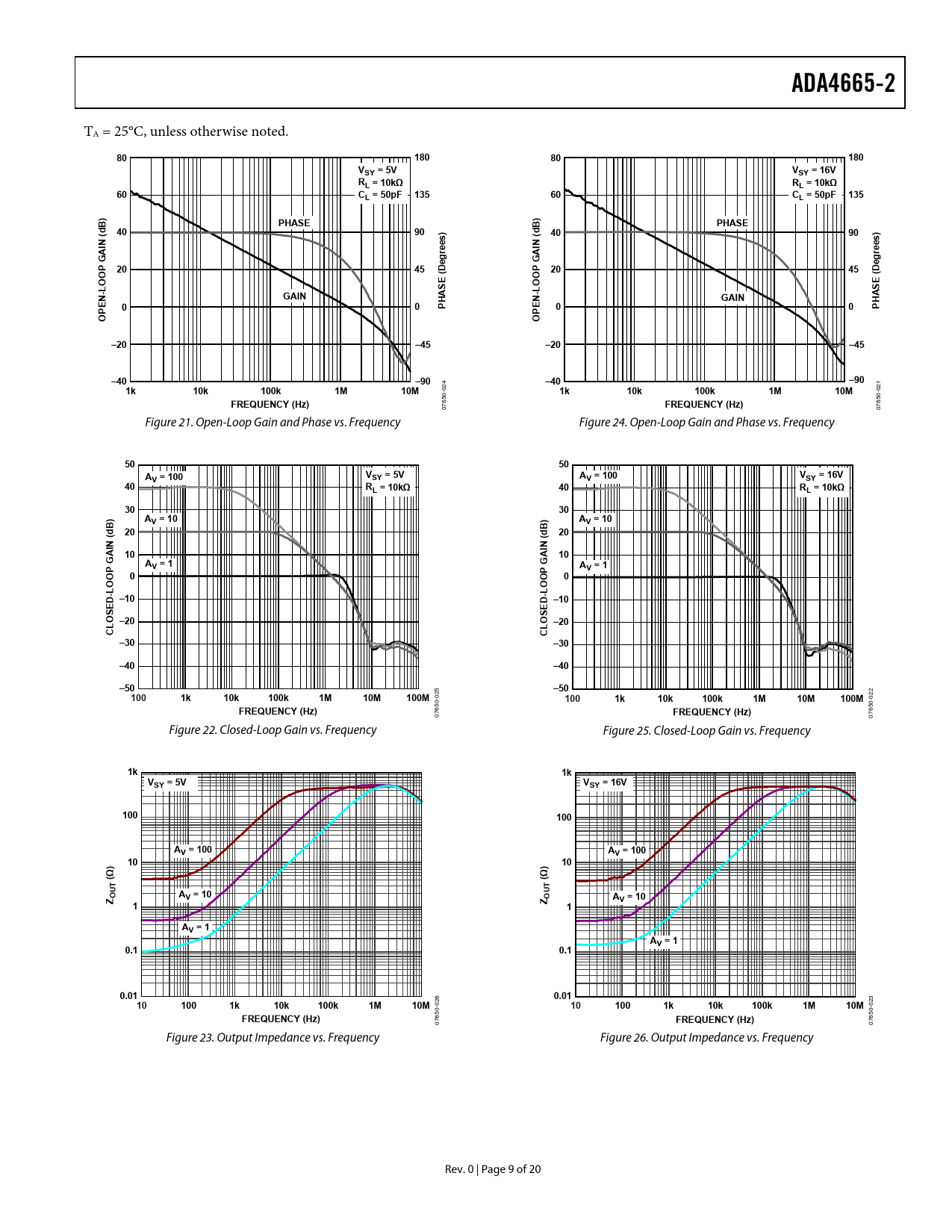 ADA4665-2. 180. VSY = 5V. VSY = 16V. RL = 10kΩ. 135. L = 50pF. PHASE. rees). GAIN. –20. –45. –40. –90. 10k. 100k. 10M. FREQUENCY (Hz). V = 100. SY = 16V