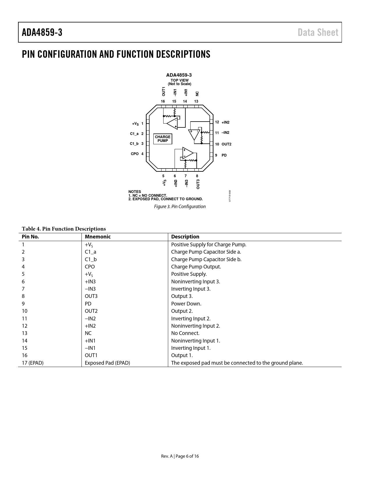ADA4859-3Data SheetPIN CONFIGURATION AND FUNCTION DESCRIPTIONSADA4859-3TOP VIEW(Not to Scale)T1N1IN1OU–I+NC16151413+V112 +IN2SC1_a 211 –IN2CHARGEPUMPC1_b 310 OUT2CPO 49PD5678SN3T3+VIN3 +–IOUNOTES 003 1. NC = NO CONNECT. 2. EXPOSED PAD, CONNECT TO GROUND. 07715- Figure 3. Pin Configuration Table 4. Pin Function Descriptions Pin No.MnemonicDescription 1 +V Positive Supply for Charge Pump. S 2 C1_a Charge Pump Capacitor Side a. 3 C1_b Charge Pump Capacitor Side b. 4 CPO Charge Pump Output. 5 +V Positive Supply. S 6 +IN3 Noninverting Input 3. 7 −IN3 Inverting Input 3. 8 OUT3 Output 3. 9 PD Power Down. 10 OUT2 Output 2. 11 −IN2 Inverting Input 2. 12 +IN2 Noninverting Input 2. 13 NC No Connect. 14 +IN1 Noninverting Input 1. 15 −IN1 Inverting Input 1. 16 OUT1 Output 1. 17 (EPAD) Exposed Pad (EPAD) The exposed pad must be connected to the ground plane. Rev. A | Page 6 of 16 Document Outline Features Applications General Description Connection Diagram Table of Contents Revision History Specifications Absolute Maximum Ratings Maximum Power Dissipation ESD Caution Pin Configuration and Function Descriptions Typical Performance Characteristics Theory of Operation Overview Charge Pump Operation Applications Information Using the ADA4859-3 in Gains Equal to +1, −1 Unity-Gain Operation Option 1 Option 2 Inverting Unity-Gain Operation Video Line Driver Power-Down Layout Considerations Power Supply Bypassing Outline Dimensions Ordering Guide