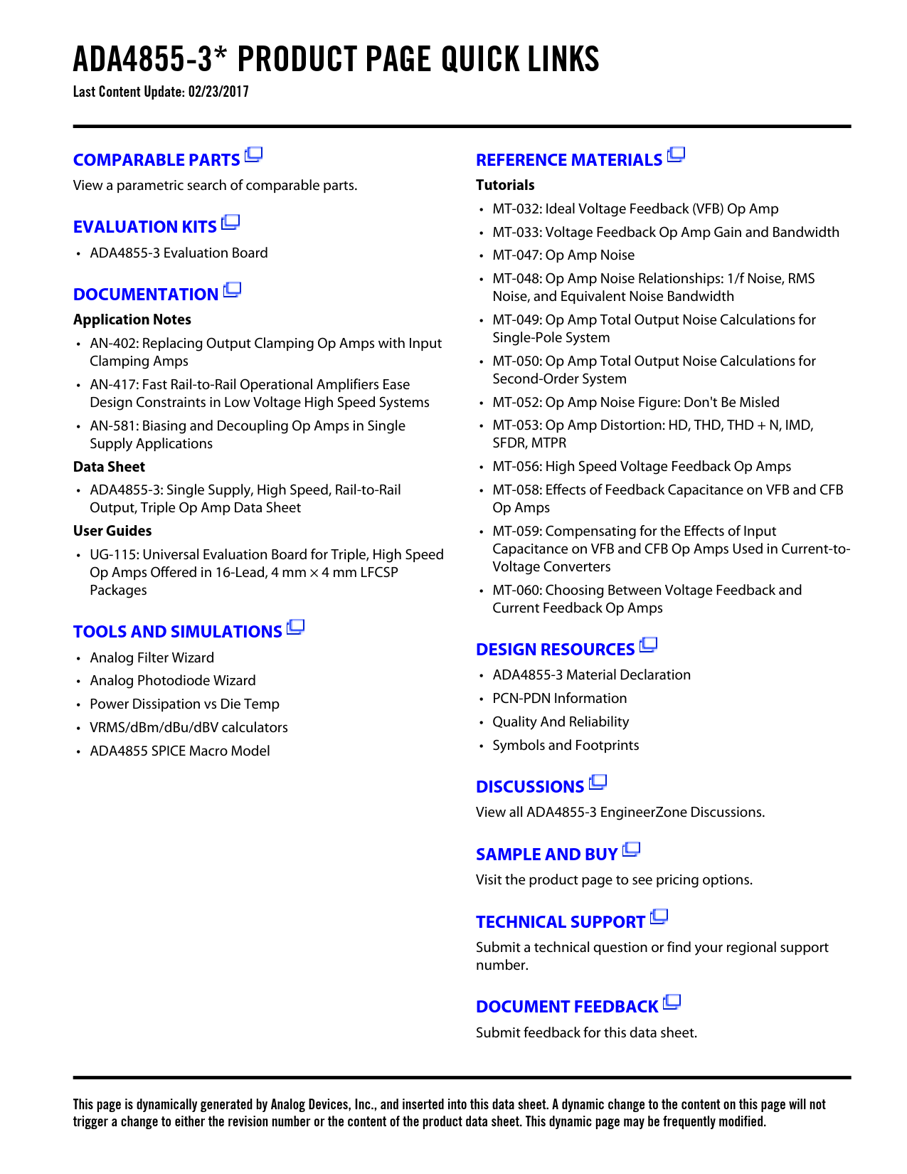 ADA4855-3* PRODUCT PAGE QUICK LINKS Last Content Update: 02/23/2017COMPARABLE PARTSREFERENCE MATERIALS View a parametric search of comparable parts. Tutorials • MT-032: Ideal Voltage Feedback (VFB) Op Amp EVALUATION KITS • MT-033: Voltage Feedback Op Amp Gain and Bandwidth • ADA4855-3 Evaluation Board • MT-047: Op Amp Noise • MT-048: Op Amp Noise Relationships: 1/f Noise, RMS DOCUMENTATION Noise, and Equivalent Noise Bandwidth Application Notes • MT-049: Op Amp Total Output Noise Calculations for • AN-402: Replacing Output Clamping Op Amps with Input Single-Pole System Clamping Amps • MT-050: Op Amp Total Output Noise Calculations for • AN-417: Fast Rail-to-Rail Operational Amplifiers Ease Second-Order System Design Constraints in Low Voltage High Speed Systems • MT-052: Op Amp Noise Figure: Don't Be Misled • AN-581: Biasing and Decoupling Op Amps in Single • MT-053: Op Amp Distortion: HD, THD, THD + N, IMD, Supply Applications SFDR, MTPR Data Sheet • MT-056: High Speed Voltage Feedback Op Amps • ADA4855-3: Single Supply, High Speed, Rail-to-Rail • MT-058: Effects of Feedback Capacitance on VFB and CFB Output, Triple Op Amp Data Sheet Op Amps User Guides • MT-059: Compensating for the Effects of Input • UG-115: Universal Evaluation Board for Triple, High Speed Capacitance on VFB and CFB Op Amps Used in Current-to- Op Amps Offered in 16-Lead, 4 mm × 4 mm LFCSP Voltage Converters Packages • MT-060: Choosing Between Voltage Feedback and Current Feedback Op Amps TOOLS AND SIMULATIONSDESIGN RESOURCES • Analog Filter Wizard • Analog Photodiode Wizard • ADA4855-3 Material Declaration • Power Dissipation vs Die Temp • PCN-PDN Information • VRMS/dBm/dBu/dBV calculators • Quality And Reliability • ADA4855 SPICE Macro Model • Symbols and Footprints DISCUSSIONS View all ADA4855-3 EngineerZone Discussions. SAMPLE AND BUY Visit the product page to see pricing options. TECHNICAL SUPPORT Submit a technical question or find your regional support number. DOCUMENT FEEDBACK Submit feedback for this data sheet. This page is dynamically generated by Analog Devices, Inc., and inserted into this data sheet. A dynamic change to the content on this page will not trigger a change to either the revision number or the content of the product data sheet. This dynamic page may be frequently modified. Document Outline Features Applications Connection Diagram General Description Revision History Specifications 5 V Operation 3.3 V Operation Absolute Maximum Ratings Thermal Resistance Maximum Power Dissipation ESD Caution Pin Configuration and Function Descriptions Typical Performance Characteristics Test Circuits Theory of Operation Applications Information Gain Configurations 20 MHz Active Low-Pass Filter RGB Video Driver Driving Multiple Video Loads PD (Power-Down) Pin Single-Supply Operation Power Supply Bypassing Layout Outline Dimensions Ordering Guide