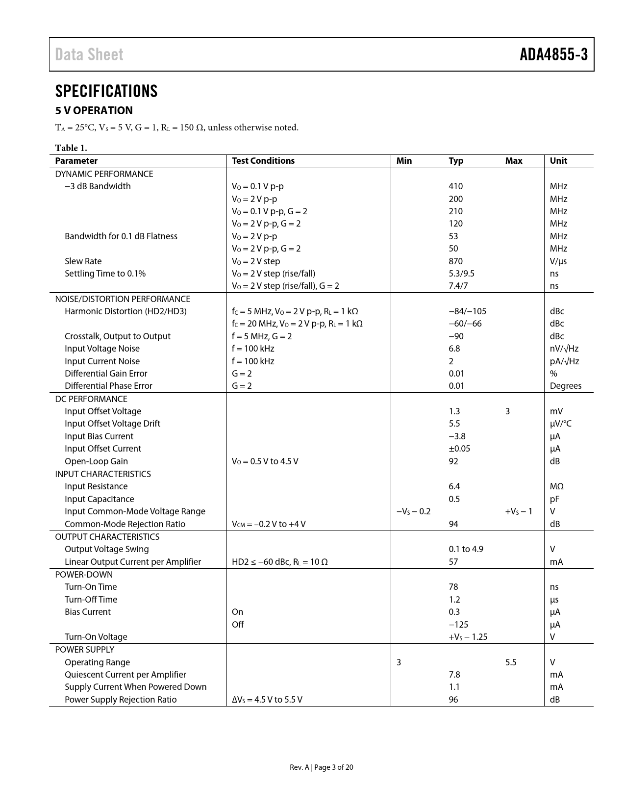 Data SheetADA4855-3SPECIFICATIONS 5 V OPERATION TA = 25°C, VS = 5 V, G = 1, RL = 150 Ω, unless otherwise noted. Table 1. ParameterTest ConditionsMinTypMaxUnit DYNAMIC PERFORMANCE −3 dB Bandwidth VO = 0.1 V p-p 410 MHz VO = 2 V p-p 200 MHz VO = 0.1 V p-p, G = 2 210 MHz VO = 2 V p-p, G = 2 120 MHz Bandwidth for 0.1 dB Flatness VO = 2 V p-p 53 MHz VO = 2 V p-p, G = 2 50 MHz Slew Rate VO = 2 V step 870 V/µs Settling Time to 0.1% VO = 2 V step (rise/fall) 5.3/9.5 ns VO = 2 V step (rise/fall), G = 2 7.4/7 ns NOISE/DISTORTION PERFORMANCE Harmonic Distortion (HD2/HD3) fC = 5 MHz, VO = 2 V p-p, RL = 1 kΩ −84/−105 dBc fC = 20 MHz, VO = 2 V p-p, RL = 1 kΩ −60/−66 dBc Crosstalk, Output to Output f = 5 MHz, G = 2 −90 dBc Input Voltage Noise f = 100 kHz 6.8 nV/√Hz Input Current Noise f = 100 kHz 2 pA/√Hz Differential Gain Error G = 2 0.01 % Differential Phase Error G = 2 0.01 Degrees DC PERFORMANCE Input Offset Voltage 1.3 3 mV Input Offset Voltage Drift 5.5 µV/°C Input Bias Current −3.8 µA Input Offset Current ±0.05 µA Open-Loop Gain VO = 0.5 V to 4.5 V 92 dB INPUT CHARACTERISTICS Input Resistance 6.4 MΩ Input Capacitance 0.5 pF Input Common-Mode Voltage Range −VS − 0.2 +VS − 1 V Common-Mode Rejection Ratio VCM = –0.2 V to +4 V 94 dB OUTPUT CHARACTERISTICS Output Voltage Swing 0.1 to 4.9 V Linear Output Current per Amplifier HD2 ≤ −60 dBc, RL = 10 Ω 57 mA POWER-DOWN Turn-On Time 78 ns Turn-Off Time 1.2 µs Bias Current On 0.3 µA Off −125 µA Turn-On Voltage +VS − 1.25 V POWER SUPPLY Operating Range 3 5.5 V Quiescent Current per Amplifier 7.8 mA Supply Current When Powered Down 1.1 mA Power Supply Rejection Ratio ∆VS = 4.5 V to 5.5 V 96 dB Rev. A | Page 3 of 20 Document Outline Features Applications Connection Diagram General Description Revision History Specifications 5 V Operation 3.3 V Operation Absolute Maximum Ratings Thermal Resistance Maximum Power Dissipation ESD Caution Pin Configuration and Function Descriptions Typical Performance Characteristics Test Circuits Theory of Operation Applications Information Gain Configurations 20 MHz Active Low-Pass Filter RGB Video Driver Driving Multiple Video Loads PD (Power-Down) Pin Single-Supply Operation Power Supply Bypassing Layout Outline Dimensions Ordering Guide