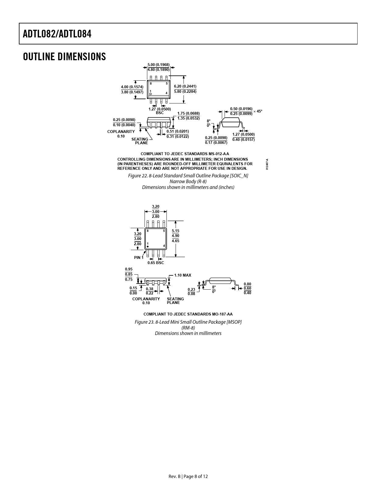 ADTL082/ADTL084OUTLINE DIMENSIONS5.00 (0.1968) 4.80 (0.1890)854.00 (0.1574)6.20 (0.2441)13.80 (0.1497)45.80 (0.2284)1.27 (0.0500)0.50 (0.0196) 45°BSC1.75 (0.0688)0.25 (0.0099)1.35 (0.0532)0.25 (0.0098)8°0.10 (0.0040)0°COPLANARITY0.51 (0.0201)1.27 (0.0500)0.100.31 (0.0122)0.25 (0.0098)SEATING0.40 (0.0157)PLANE0.17 (0.0067)COMPLIANT TO JEDEC STANDARDS MS-012-AACONTROLLING DIMENSIONS ARE IN MILLIMETERS; INCH DIMENSIONS-A(IN PARENTHESES) ARE ROUNDED-OFF MILLIMETER EQUIVALENTS FOR07 24REFERENCE ONLY AND ARE NOT APPROPRIATE FOR USE IN DESIGN.01 Figure 22. 8-Lead Standard Small Outline Package [SOIC_N] Narrow Body (R-8) Dimensions shown in millimeters and (inches) 3.20 3.00 2.80855.153.204.903.004.652.8014PIN 10.65 BSC0.95 0.851.10 MAX0.750.800.158°0.380.600.230°0.000.220.400.08COPLANARITYSEATING0.10PLANECOMPLIANT TO JEDEC STANDARDS MO-187-AA Figure 23. 8-Lead Mini Small Outline Package [MSOP] (RM-8) Dimensions shown in millimeters Rev. B | Page 8 of 12 Document Outline FEATURES APPLICATIONS PIN CONFIGURATIONS GENERAL DESCRIPTION TABLE OF CONTENTS REVISION HISTORY SPECIFICATIONS ABSOLUTE MAXIMUM RATINGS THERMAL RESISTANCE POWER SEQUENCING ESD CAUTION TYPICAL PERFORMANCE CHARACTERISTICS OUTLINE DIMENSIONS ORDERING GUIDE