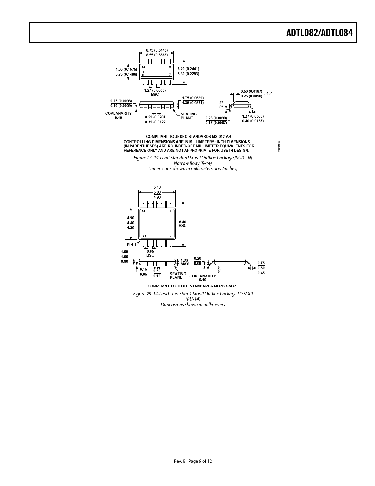 ADTL082/ADTL0848.75 (0.3445) 8.55 (0.3366)1484.00 (0.1575)6.20 (0.2441)13.80 (0.1496)75.80 (0.2283)1.27 (0.0500)0.50 (0.0197)BSC45°1.75 (0.0689)0.25 (0.0098)0.25 (0.0098)1.35 (0.0531)8°0.10 (0.0039)0°COPLANARITYSEATING0.100.51 (0.0201)PLANE1.27 (0.0500)0.25 (0.0098)0.31 (0.0122)0.40 (0.0157)0.17 (0.0067)COMPLIANT TO JEDEC STANDARDS MS-012-ABCONTROLLING DIMENSIONS ARE IN MILLIMETERS; INCH DIMENSIONS-A(IN PARENTHESES) ARE ROUNDED-OFF MILLIMETER EQUIVALENTS FOR06 06REFERENCE ONLY AND ARE NOT APPROPRIATE FOR USE IN DESIGN.06 Figure 24. 14-Lead Standard Small Outline Package [SOIC_N] Narrow Body (R-14) Dimensions shown in millimeters and (inches) 5.10 5.00 4.901484.50 4.406.40BSC4.3017PIN 11.050.65BSC1.001.200.200.80MAX0.090.758°0.150.600.300°0.05SEATING0.450.19PLANECOPLANARITY0.10COMPLIANT TO JEDEC STANDARDS MO-153-AB-1 Figure 25. 14-Lead Thin Shrink Small Outline Package [TSSOP] (RU-14) Dimensions shown in millimeters Rev. B | Page 9 of 12 Document Outline FEATURES APPLICATIONS PIN CONFIGURATIONS GENERAL DESCRIPTION TABLE OF CONTENTS REVISION HISTORY SPECIFICATIONS ABSOLUTE MAXIMUM RATINGS THERMAL RESISTANCE POWER SEQUENCING ESD CAUTION TYPICAL PERFORMANCE CHARACTERISTICS OUTLINE DIMENSIONS ORDERING GUIDE