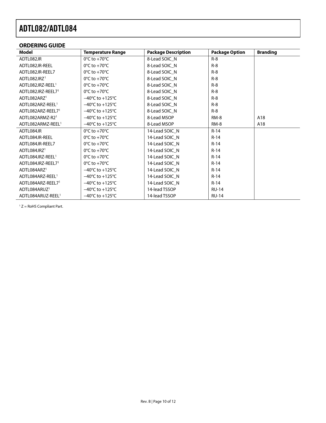 link to page 12 link to page 10 link to page 10 link to page 10 link to page 10 link to page 10 link to page 10 link to page 10 link to page 10 link to page 10 link to page 10 link to page 10 link to page 10 link to page 10 link to page 10 link to page 10 link to page 10 link to page 10 link to page 10 link to page 10 link to page 10 link to page 10 link to page 10 link to page 10 link to page 10 link to page 10 link to page 10 link to page 10 link to page 10 ADTL082/ADTL084ORDERING GUIDE ModelTemperature RangePackage DescriptionPackage OptionBranding ADTL082JR 0°C to +70°C 8-Lead SOIC_N R-8 ADTL082JR-REEL 0°C to +70°C 8-Lead SOIC_N R-8 ADTL082JR-REEL7 0°C to +70°C 8-Lead SOIC_N R-8 ADTL082JRZ1 0°C to +70°C 8-Lead SOIC_N R-8 ADTL082JRZ-REEL1 0°C to +70°C 8-Lead SOIC_N R-8 ADTL082JRZ-REEL71 0°C to +70°C 8-Lead SOIC_N R-8 ADTL082ARZ1 −40°C to +125°C 8-Lead SOIC_N R-8 ADTL082ARZ-REEL1 −40°C to +125°C 8-Lead SOIC_N R-8 ADTL082ARZ-REEL71 −40°C to +125°C 8-Lead SOIC_N R-8 ADTL082ARMZ-R21 −40°C to +125°C 8-Lead MSOP RM-8 A18 ADTL082ARMZ-REEL1 −40°C to +125°C 8-Lead MSOP RM-8 A18 ADTL084JR 0°C to +70°C 14-Lead SOIC_N R-14 ADTL084JR-REEL 0°C to +70°C 14-Lead SOIC_N R-14 ADTL084JR-REEL7 0°C to +70°C 14-Lead SOIC_N R-14 ADTL084JRZ1 0°C to +70°C 14-Lead SOIC_N R-14 ADTL084JRZ-REEL1 0°C to +70°C 14-Lead SOIC_N R-14 ADTL084JRZ-REEL71 0°C to +70°C 14-Lead SOIC_N R-14 ADTL084ARZ1 −40°C to +125°C 14-Lead SOIC_N R-14 ADTL084ARZ-REEL1 −40°C to +125°C 14-Lead SOIC_N R-14 ADTL084ARZ-REEL71 −40°C to +125°C 14-Lead SOIC_N R-14 ADTL084ARUZ1 −40°C to +125°C 14-lead TSSOP RU-14 ADTL084ARUZ-REEL1 −40°C to +125°C 14-lead TSSOP RU-14 1 Z = RoHS Compliant Part. Rev. B | Page 10 of 12 Document Outline FEATURES APPLICATIONS PIN CONFIGURATIONS GENERAL DESCRIPTION TABLE OF CONTENTS REVISION HISTORY SPECIFICATIONS ABSOLUTE MAXIMUM RATINGS THERMAL RESISTANCE POWER SEQUENCING ESD CAUTION TYPICAL PERFORMANCE CHARACTERISTICS OUTLINE DIMENSIONS ORDERING GUIDE