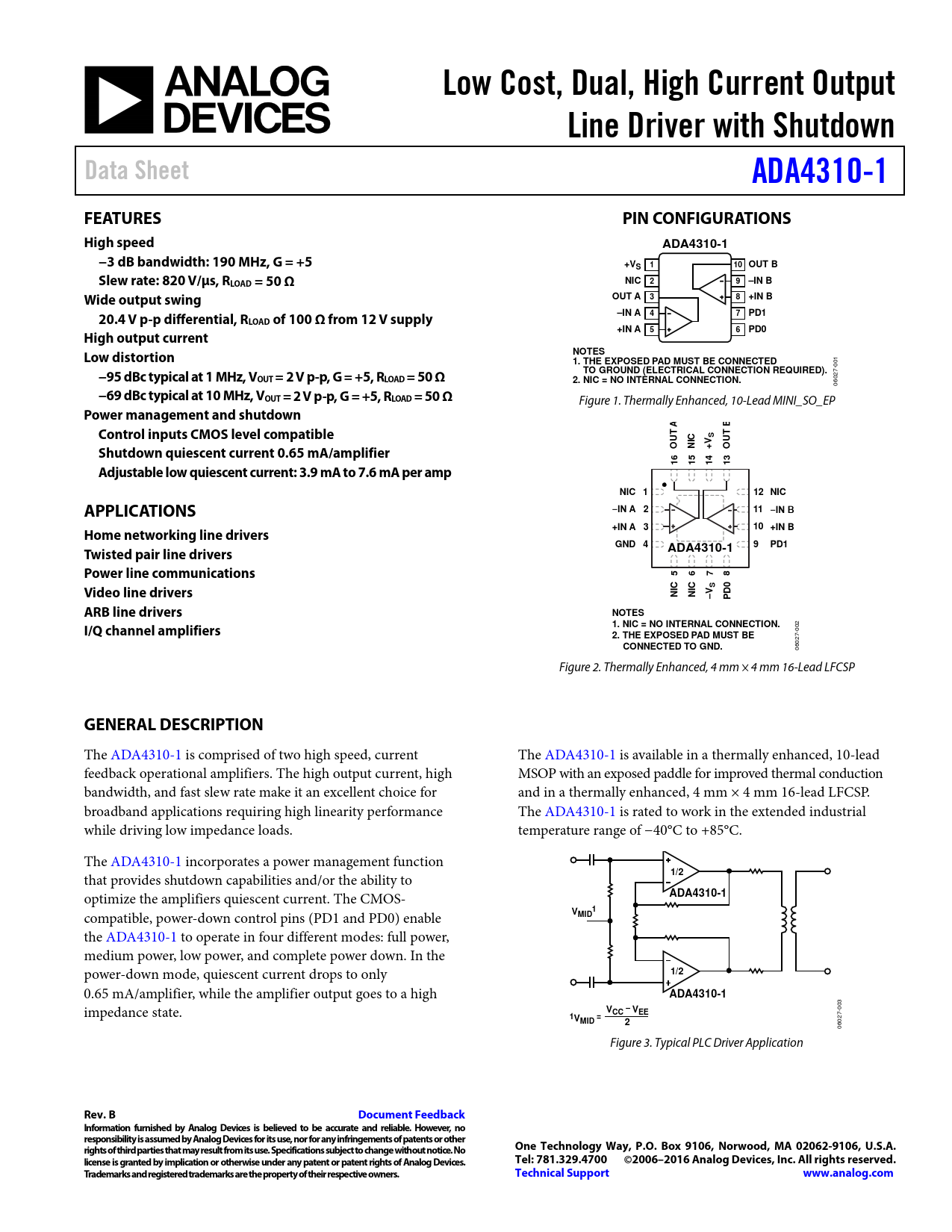 Low Cost, Dual, High Current Output. Line Driver with Shutdown. Data Sheet. ADA4310-1. FEATURES. PIN CONFIGURATIONS. High speed