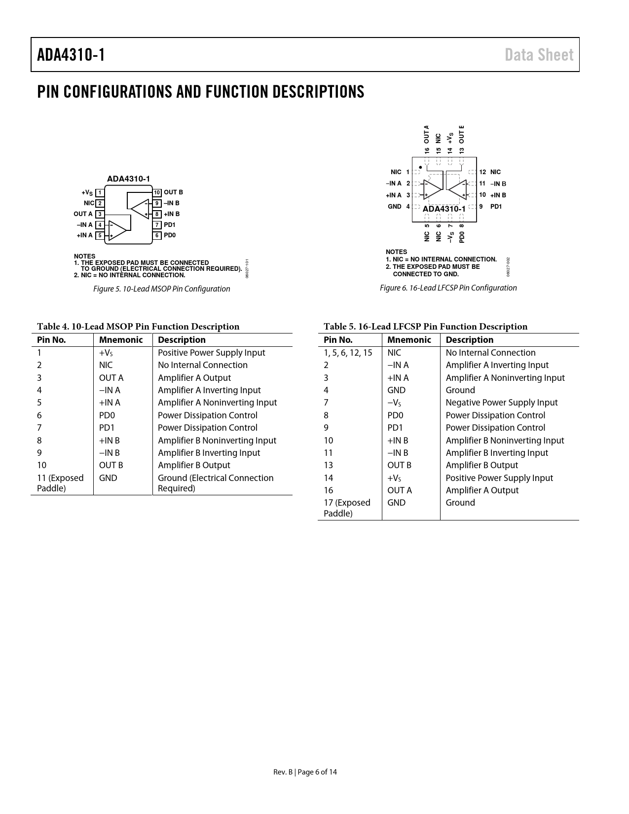 ADA4310-1. Data Sheet. PIN CONFIGURATIONS AND FUNCTION DESCRIPTIONS. T B. NIC 1. 12 NIC. −IN A 2. 11 −IN B. +VS 1. 10 OUT B. +IN A 3