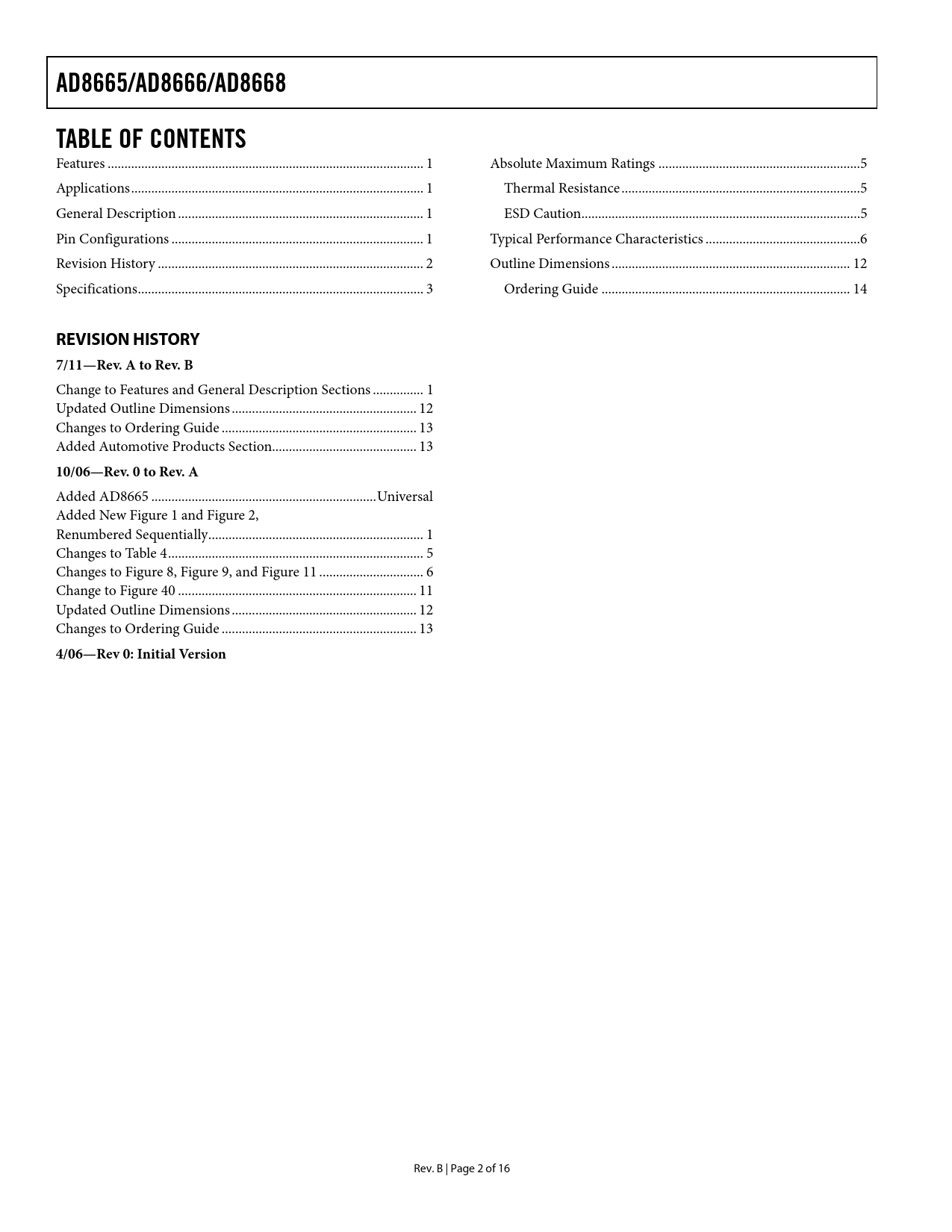 link to page 1 link to page 1 link to page 1 link to page 1 link to page 2 link to page 3 link to page 5 link to page 5 link to page 5 link to page 6 link to page 12 link to page 14 AD8665/AD8666/AD8668TABLE OF CONTENTS Features .. 1 Absolute Maximum Ratings ..5 Applications ... 1 Thermal Resistance ...5 General Description ... 1 ESD Caution...5 Pin Configurations ... 1 Typical Performance Characteristics ..6 Revision History ... 2 Outline Dimensions ... 12 Specifications ... 3 Ordering Guide .. 14 REVISION HISTORY 7/11—Rev. A to Rev. B Change to Features and General Description Sections ... 1 Updated Outline Dimensions ... 12 Changes to Ordering Guide .. 13 Added Automotive Products Section... 13 10/06—Rev. 0 to Rev. A Added AD8665 ... Universal Added New Figure 1 and Figure 2, Renumbered Sequential y .. 1 Changes to Table 4 .. 5 Changes to Figure 8, Figure 9, and Figure 11 ... 6 Change to Figure 40 ... 11 Updated Outline Dimensions ... 12 Changes to Ordering Guide .. 13 4/06—Rev 0: Initial Version Rev. B | Page 2 of 16 Document Outline Features Applications General Description Pin Configurations Revision History Specifications Absolute Maximum Ratings Thermal Resistance ESD Caution Typical Performance Characteristics Outline Dimensions Ordering Guide