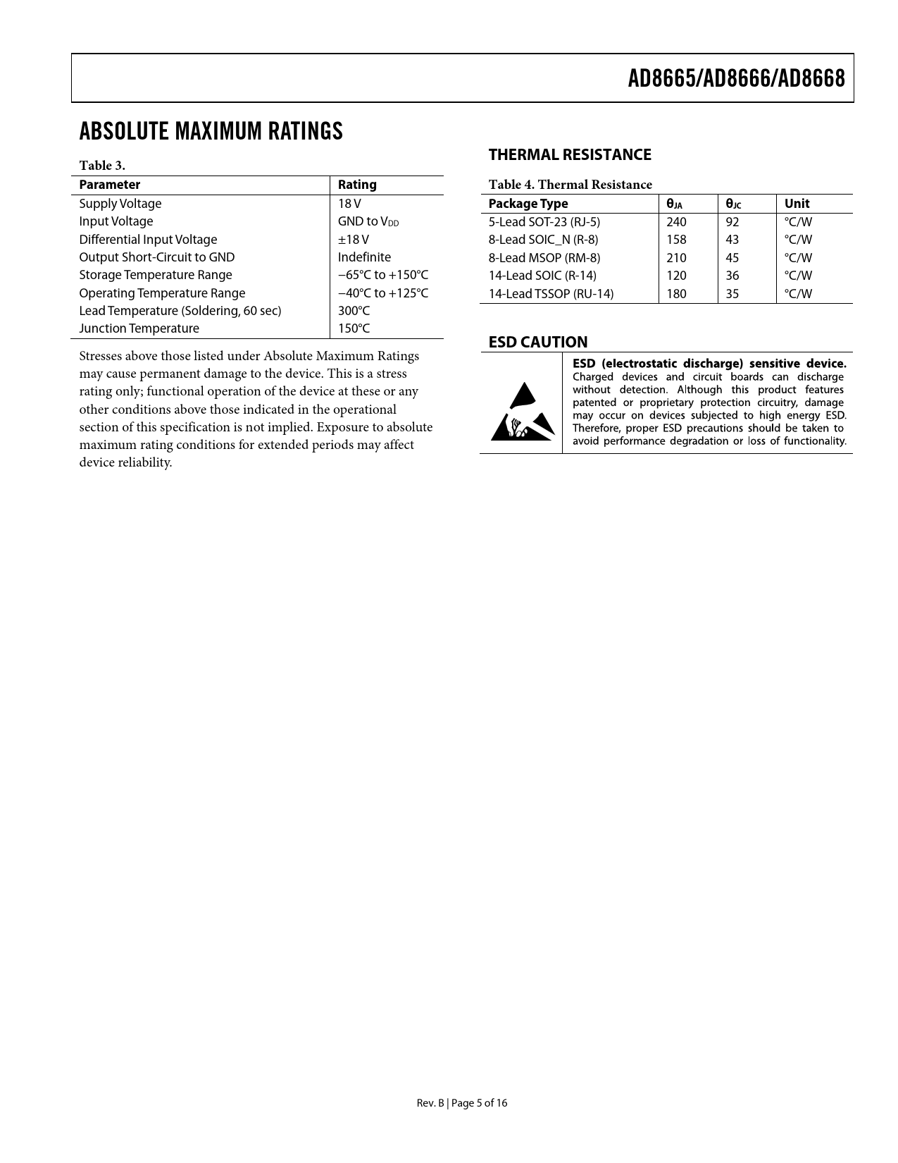 AD8665/AD8666/AD8668ABSOLUTE MAXIMUM RATINGSTHERMAL RESISTANCETable 3. ParameterRatingTable 4. Thermal Resistance Supply Voltage 18 V Package TypeθJAθJCUnit Input Voltage GND to VDD 5-Lead SOT-23 (RJ-5) 240 92 °C/W Differential Input Voltage ±18 V 8-Lead SOIC_N (R-8) 158 43 °C/W Output Short-Circuit to GND Indefinite 8-Lead MSOP (RM-8) 210 45 °C/W Storage Temperature Range −65°C to +150°C 14-Lead SOIC (R-14) 120 36 °C/W Operating Temperature Range −40°C to +125°C 14-Lead TSSOP (RU-14) 180 35 °C/W Lead Temperature (Soldering, 60 sec) 300°C Junction Temperature 150°C ESD CAUTION Stresses above those listed under Absolute Maximum Ratings may cause permanent damage to the device. This is a stress rating only; functional operation of the device at these or any other conditions above those indicated in the operational section of this specification is not implied. Exposure to absolute maximum rating conditions for extended periods may affect device reliability. Rev. B | Page 5 of 16 Document Outline Features Applications General Description Pin Configurations Revision History Specifications Absolute Maximum Ratings Thermal Resistance ESD Caution Typical Performance Characteristics Outline Dimensions Ordering Guide