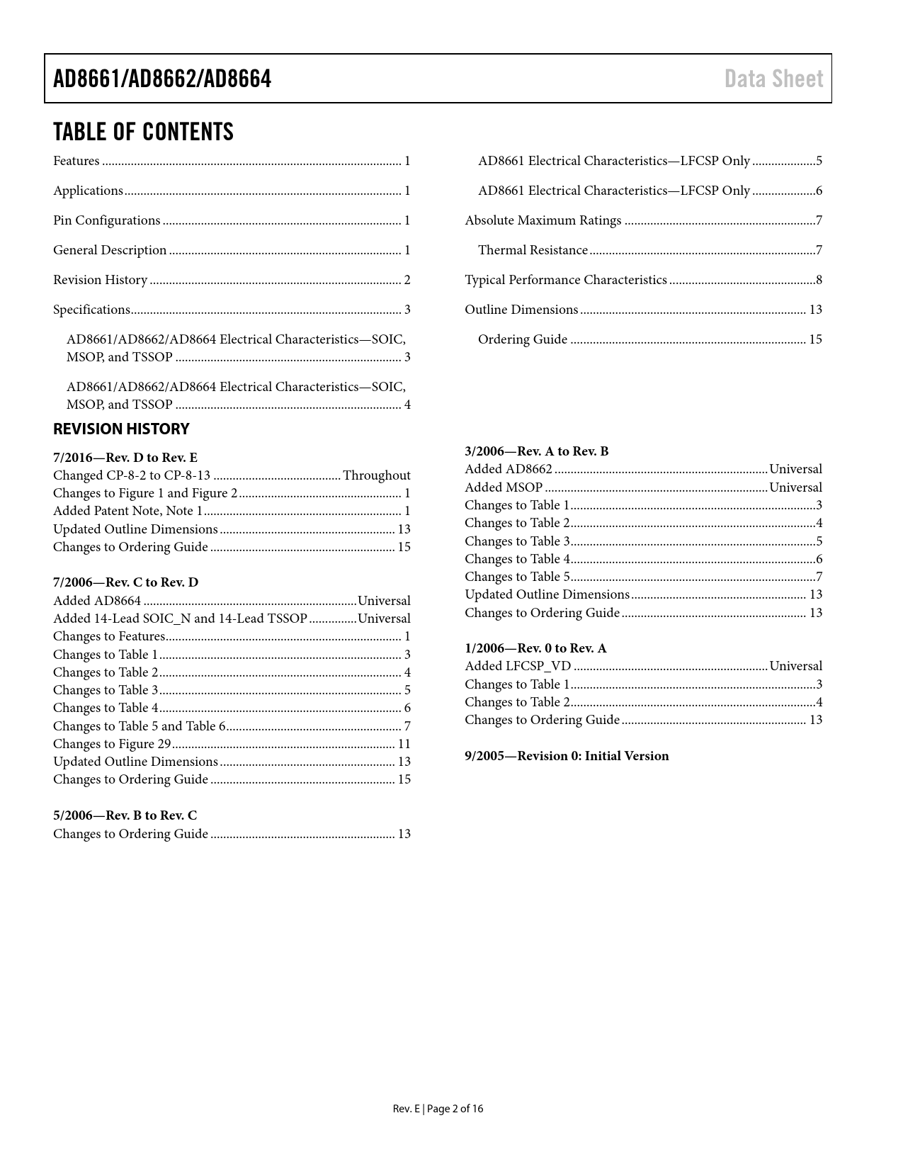 Pages / Page16 / 2 — AD8661/AD8662/AD8664. Data Sheet. TABLE OF CONTENTS. REVISION HISTORY. …