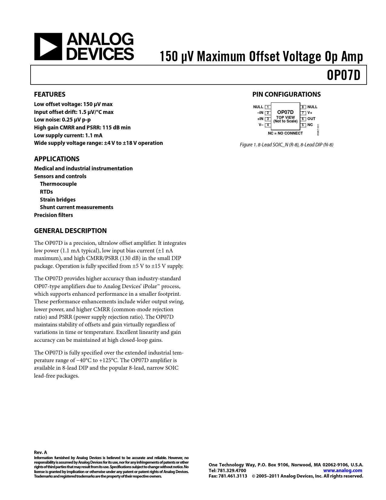 The OP07D is a precision, ultralow offset amplifier. It integrates low power (1.1 mA typical), low input bias current (±1 nA maximum), and high CMRR/PSRR (130 dB) in the small DIP package. Operation is ful y specified from ±5 V to ±15 V supply. The OP07D provides higher accuracy than industry-standard OP07-type amplifiers due to Analog Devices’ iPolar™ process, which supports enhanced performance in a smal er footprint. These performance enhancements include wider output swing, lower power, and higher CMRR (common-mode rejection ratio) and PSRR (power supply rejection ratio). The OP07D maintains stability of offsets and gain virtually regardless of variations in time or temperature. Excel ent linearity and gain accuracy can be maintained at high closed-loop gains. The OP07D is fully specified over the extended industrial tem- perature range of −40°C to +125°C. The OP07D amplifier is available in 8-lead DIP and the popular 8-lead, narrow SOIC lead-free packages.