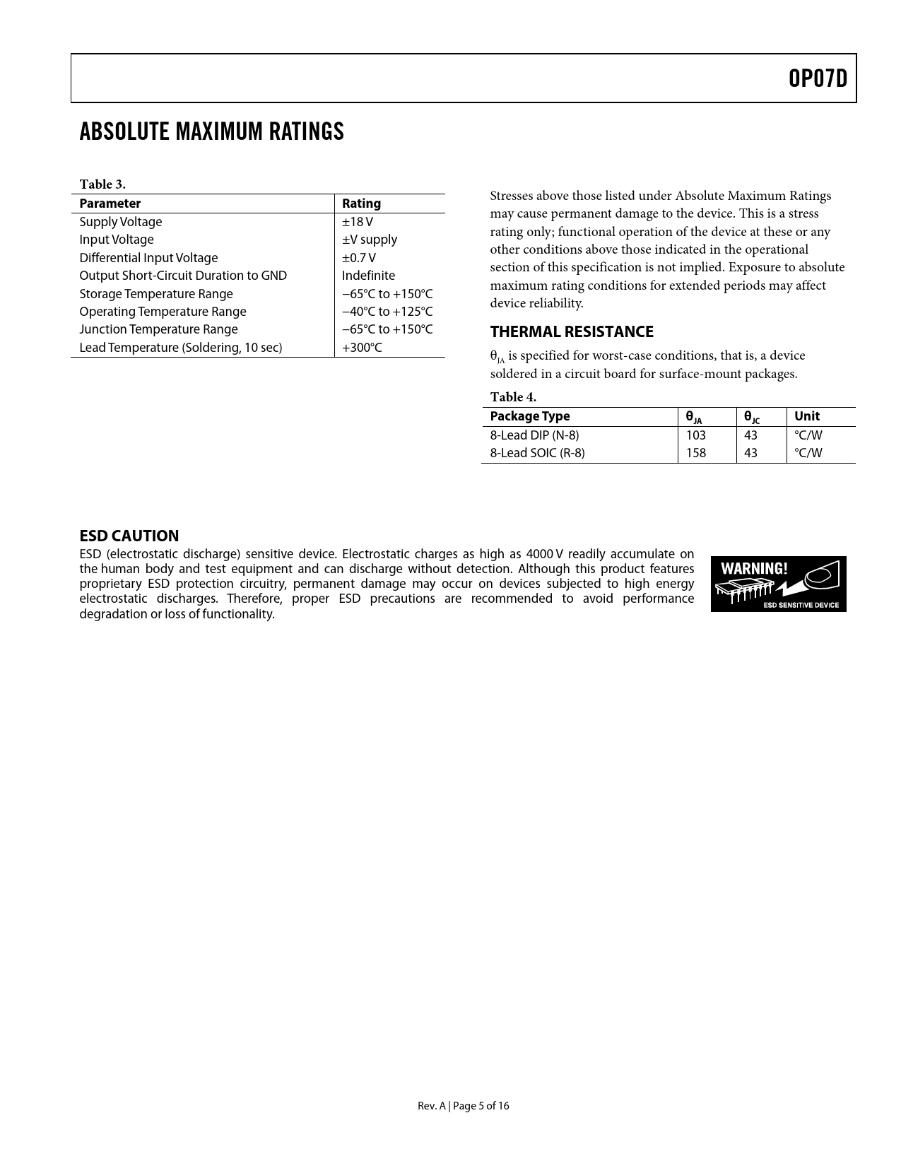 OP07D. ABSOLUTE MAXIMUM RATINGS. Table 3. Parameter. Rating. THERMAL RESISTANCE. Table 4. Package Type. Unit. ESD CAUTION