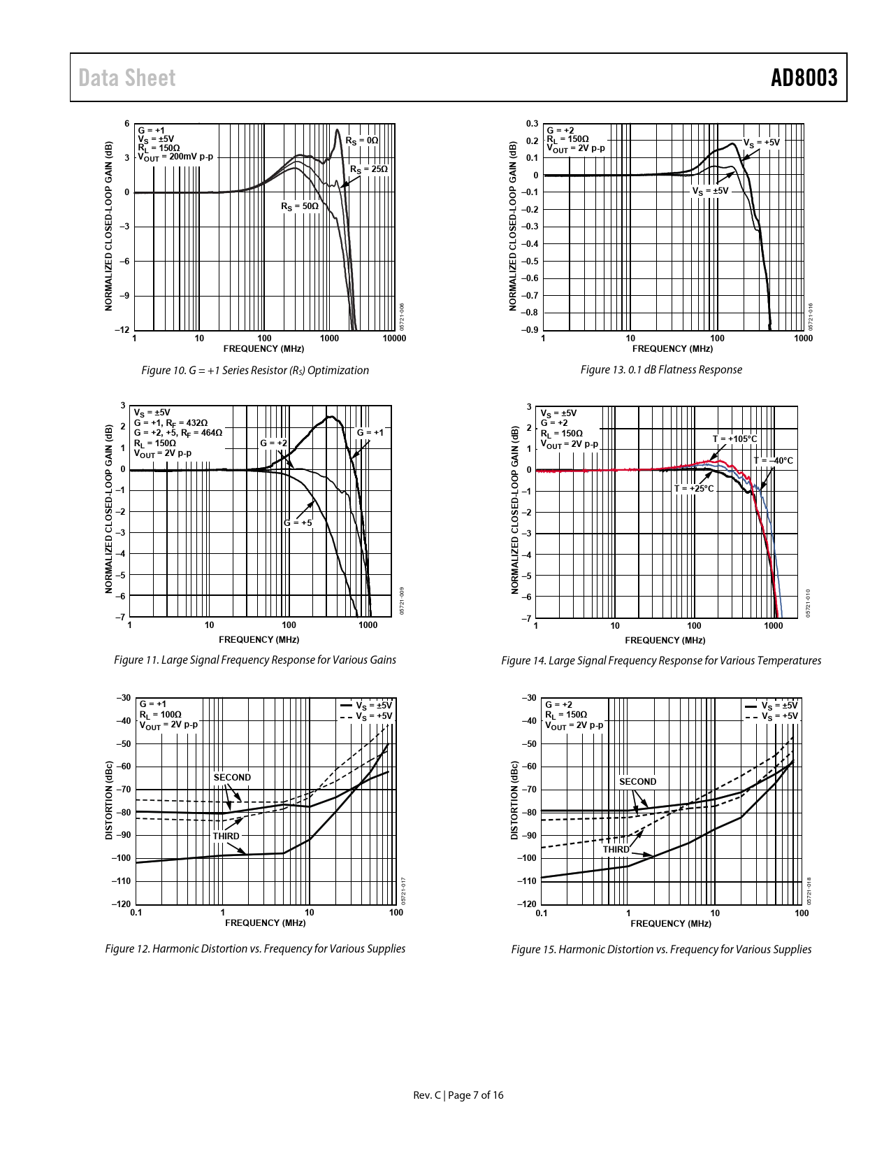 Figure 12. Harmonic Distortion vs. Frequency for Various Supplies Figure 15. Harmonic Distortion vs. Frequency for Various Supplies Rev. C | Page 7 of 16 Document Outline Features Applications Connection Diagram General Description Table of Contents Revision History Specifications with ±5 V Supply Specifications with +5 V Supply Absolute Maximum Ratings Thermal Resistance Maximum Power Dissipation ESD Caution Typical Performance Characteristics Applications Information Gain Configurations RGB Video Driver Printed Circuit Board Layout Low Distortion Pinout Signal Routing Exposed Paddle Power Supply Bypassing Grounding Outline Dimensions Ordering Guide