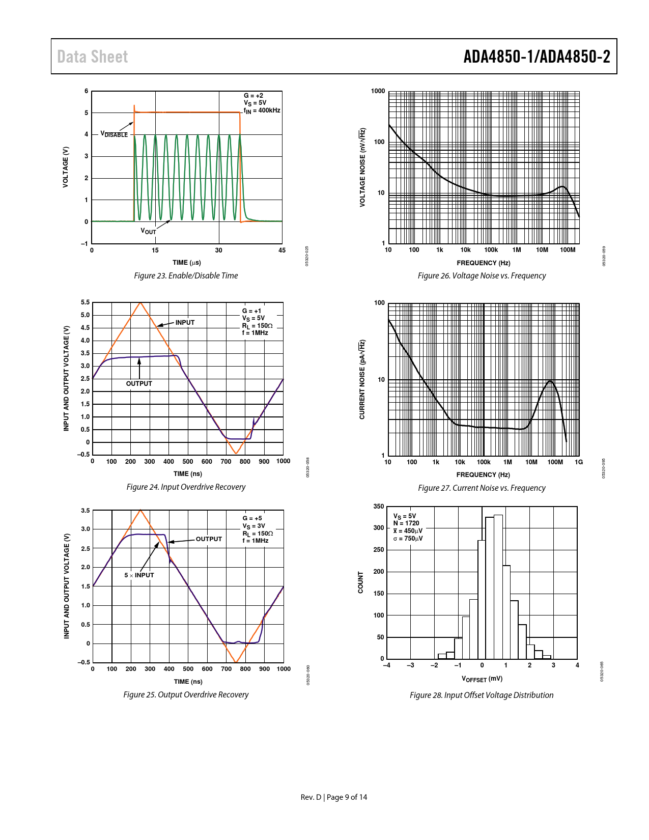 Data Sheet. ADA4850-1/ADA4850-2. 1000. G = +2 VS = 5V. fIN = 400kHz. ) z. VDISABLE. V/ H. 100. OISE (. VOLTAGE (V). GE N. VOLTA. VOUT. 10k. 100k. 10M