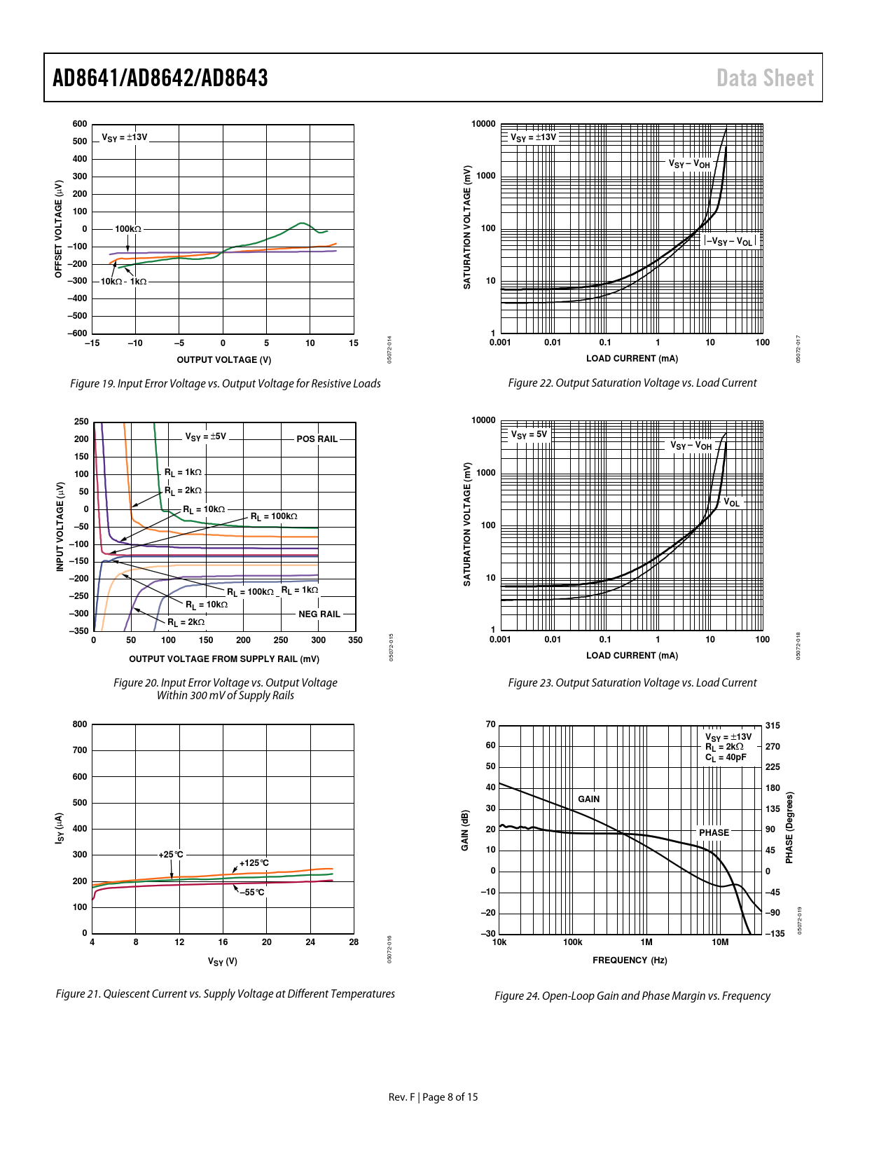 AD8641/AD8642/AD8643Data Sheet60010000VV500SY = ± 13VSY = ± 13V400VSY – VOH3001000 µ V)2001000100k Ω 100–V–100SY – VOL–200OFFSET VOLTAGE ( –300 10k Ω 1k Ω 10SATURATION VOLTAGE (mV)–400–500–6001–15–10–50510150.0010.010.1110100OUTPUT VOLTAGE (V) 05072-014 LOAD CURRENT (mA) 05072-017 Figure 19. Input Error Voltage vs. Output Voltage for Resistive Loads Figure 22. Output Saturation Voltage vs. Load Current 25010000V200VSY = ± 5VPOS RAILSY = 5VVSY – VOH150100RL = 1k Ω 1000 µ V)50RL = 2k Ω VOL0RL = 10k Ω RL = 100k Ω –50100–100–150INPUT VOLTAGE (–20010SATURATION VOLTAGE (mV)RR–250L = 100k Ω L = 1k Ω RL = 10k Ω –300NEG RAILRL = 2k Ω –35010501001502002503003500.0010.010.1110100OUTPUT VOLTAGE FROM SUPPLY RAIL (mV)LOAD CURRENT (mA) 05072-015 05072-018 Figure 20. Input Error Voltage vs. Output Voltage Figure 23. Output Saturation Voltage vs. Load Current Within 300 mV of Supply Rails 80070315VSY = ± 13V60700R270L = 2k Ω CL = 40pF5022560040180500GAIN30135 µ A) ( 4002090PHASEI SYGAIN (dB)1045300+25°C+125°CPHASE (Degrees)00200–55°C–10–45100–20–900–30–135 05072-019 48121620242810k100k1M10MVSY (V) 05072-016 FREQUENCY (Hz) Figure 21. Quiescent Current vs. Supply Voltage at Different Temperatures Figure 24. Open-Loop Gain and Phase Margin vs. Frequency Rev. F | Page 8 of 15 Document Outline FEATURES APPLICATIONS GENERAL DESCRIPTION PIN CONFIGURATIONS TABLE OF CONTENTS REVISION HISTORY SPECIFICATIONS ELECTRICAL CHARACTERISTICS ABSOLUTE MAXIMUM RATINGS THERMAL RESISTANCE ESD CAUTION TYPICAL PERFORMANCE CHARACTERISTICS OUTLINE DIMENSIONS ORDERING GUIDE