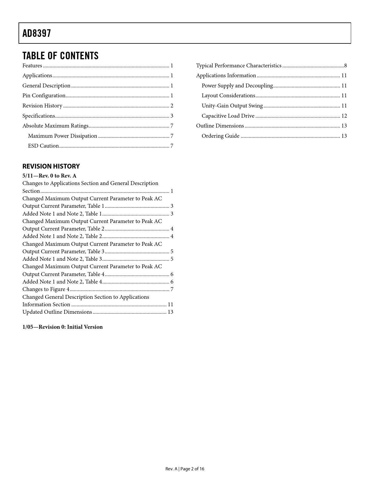 AD8397. TABLE OF CONTENTS. REVISION HISTORY. 5/11—Rev. 0 to Rev. A. 1/05—Revision 0: Initial Version