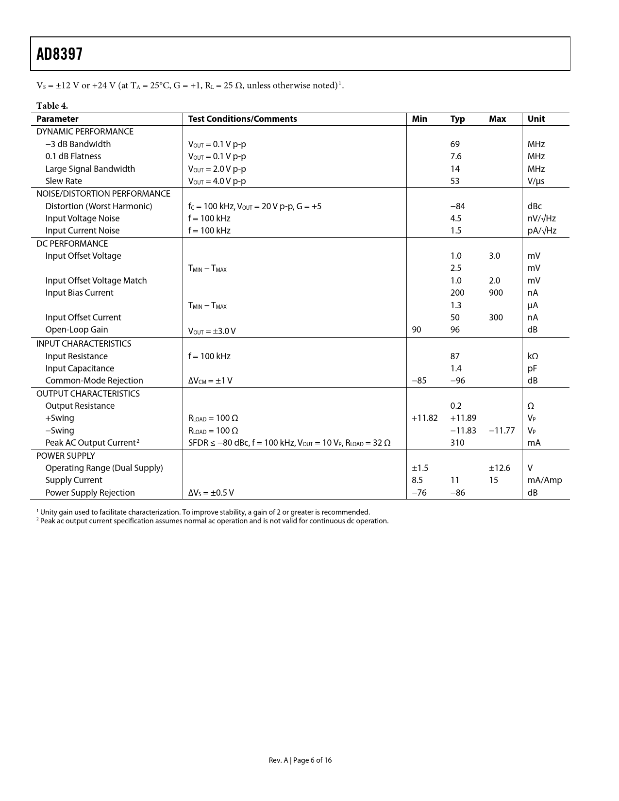 link to page 7 link to page 7 AD8397 VS = ±12 V or +24 V (at TA = 25°C, G = +1, RL = 25 Ω, unless otherwise noted)1. Table 4. Parameter TestConditions/Comments MinTypMaxUnit DYNAMIC PERFORMANCE −3 dB Bandwidth VOUT = 0.1 V p-p 69 MHz 0.1 dB Flatness VOUT = 0.1 V p-p 7.6 MHz Large Signal Bandwidth VOUT = 2.0 V p-p 14 MHz Slew Rate VOUT = 4.0 V p-p 53 V/μs NOISE/DISTORTION PERFORMANCE Distortion (Worst Harmonic) fC = 100 kHz, VOUT = 20 V p-p, G = +5 −84 dBc Input Voltage Noise f = 100 kHz 4.5 nV/√Hz Input Current Noise f = 100 kHz 1.5 pA/√Hz DC PERFORMANCE Input Offset Voltage 1.0 3.0 mV TMIN − TMAX 2.5 mV Input Offset Voltage Match 1.0 2.0 mV Input Bias Current 200 900 nA TMIN − TMAX 1.3 μA Input Offset Current 50 300 nA Open-Loop Gain VOUT = ±3.0 V 90 96 dB INPUT CHARACTERISTICS Input Resistance f = 100 kHz 87 kΩ Input Capacitance 1.4 pF Common-Mode Rejection ∆VCM = ±1 V −85 −96 dB OUTPUT CHARACTERISTICS Output Resistance 0.2 Ω +Swing RLOAD = 100 Ω +11.82 +11.89 VP −Swing RLOAD = 100 Ω −11.83 −11.77 VP Peak AC Output Current2 SFDR ≤ −80 dBc, f = 100 kHz, VOUT = 10 VP, RLOAD = 32 Ω 310 mA POWER SUPPLY Operating Range (Dual Supply) ±1.5 ±12.6 V Supply Current 8.5 11 15 mA/Amp Power Supply Rejection ∆VS = ±0.5 V −76 −86 dB 1 Unity gain used to facilitate characterization. To improve stability, a gain of 2 or greater is recommended. 2 Peak ac output current specification assumes normal ac operation and is not valid for continuous dc operation. Rev. A | Page 6 of 16 Document Outline FEATURES APPLICATIONS GENERAL DESCRIPTION PIN CONFIGURATION TABLE OF CONTENTS REVISION HISTORY SPECIFICATIONS ABSOLUTE MAXIMUM RATINGS MAXIMUM POWER DISSIPATION ESD CAUTION TYPICAL PERFORMANCE CHARACTERISTICS APPLICATIONS INFORMATION POWER SUPPLY AND DECOUPLING LAYOUT CONSIDERATIONS UNITY-GAIN OUTPUT SWING CAPACITIVE LOAD DRIVE OUTLINE DIMENSIONS ORDERING GUIDE
