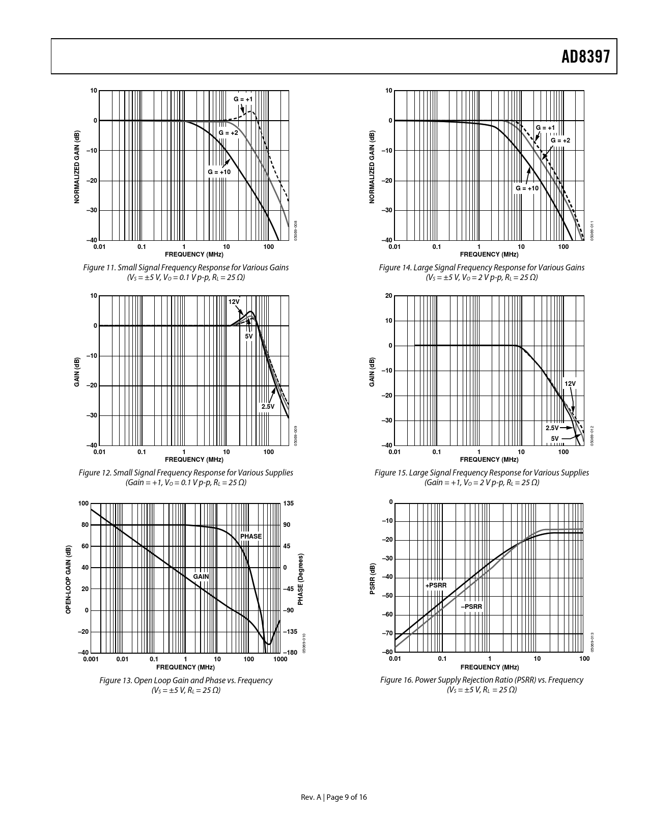 AD8397. G = +1. G = +2. –10. GAIN (dB). G = +10. –20. NORMALIZE. –30. –40. 0.01. 0.1. 100. FREQUENCY (MHz). 12V. GAIN (. 2.5V. 135. PHASE. B) d. ees). GAIN. (Degr