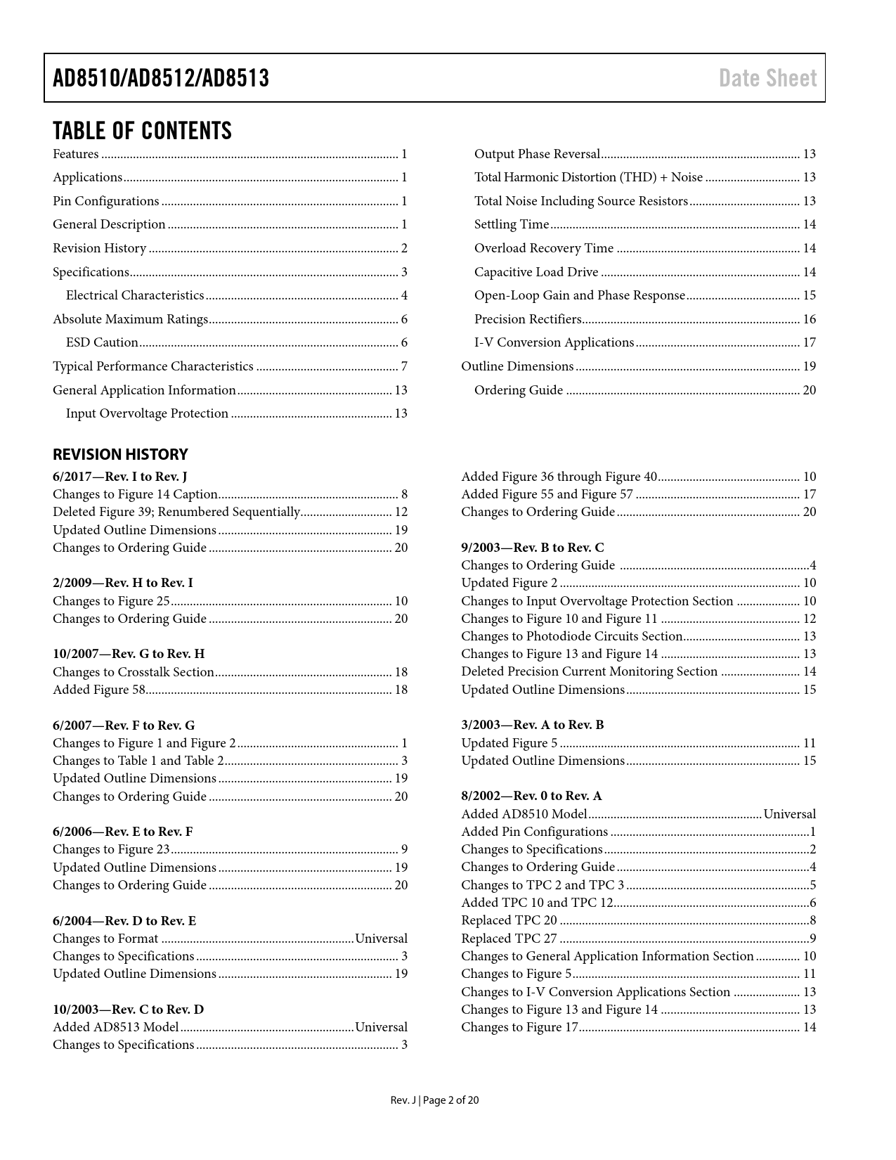 link to page 1 link to page 1 link to page 1 link to page 1 link to page 2 link to page 3 link to page 4 link to page 6 link to page 6 link to page 7 link to page 13 link to page 13 link to page 13 link to page 13 link to page 13 link to page 14 link to page 14 link to page 14 link to page 15 link to page 16 link to page 17 link to page 19 link to page 20 AD8510/AD8512/AD8513Date SheetTABLE OF CONTENTS Features .. 1 Output Phase Reversal ... 13 Applications ... 1 Total Harmonic Distortion (THD) + Noise .. 13 Pin Configurations ... 1 Total Noise Including Source Resistors ... 13 General Description ... 1 Settling Time ... 14 Revision History ... 2 Overload Recovery Time .. 14 Specifications ... 3 Capacitive Load Drive ... 14 Electrical Characteristics ... 4 Open-Loop Gain and Phase Response .. 15 Absolute Maximum Ratings .. 6 Precision Rectifiers... 16 ESD Caution .. 6 I-V Conversion Applications .. 17 Typical Performance Characteristics ... 7 Outline Dimensions ... 19 General Application Information ... 13 Ordering Guide .. 20 Input Overvoltage Protection ... 13 REVISION HISTORY 6/2017—Rev. I to Rev. J Added Figure 36 through Figure 40 ... 10 Changes to Figure 14 Caption ... 8 Added Figure 55 and Figure 57 .. 17 Deleted Figure 39; Renumbered Sequentially... 12 Changes to Ordering Guide .. 20 Updated Outline Dimensions ... 19 Changes to Ordering Guide .. 20 9/2003—Rev. B to Rev. C Changes to Ordering Guide .. 4 2/2009—Rev. H to Rev. I Updated Figure 2 .. 10 Changes to Figure 25 .. 10 Changes to Input Overvoltage Protection Section .. 10 Changes to Ordering Guide .. 20 Changes to Figure 10 and Figure 11 .. 12 Changes to Photodiode Circuits Section... 13 10/2007—Rev. G to Rev. H Changes to Figure 13 and Figure 14 .. 13 Changes to Crosstalk Section .. 18 Deleted Precision Current Monitoring Section ... 14 Added Figure 58 .. 18 Updated Outline Dimensions ... 15 6/2007—Rev. F to Rev. G3/2003—Rev. A to Rev. B Changes to Figure 1 and Figure 2 ... 1 Updated Figure 5 .. 11 Changes to Table 1 and Table 2 ... 3 Updated Outline Dimensions ... 15 Updated Outline Dimensions ... 19 Changes to Ordering Guide .. 20 8/2002—Rev. 0 to Rev. A Added AD8510 Model ... Universal 6/2006—Rev. E to Rev. F Added Pin Configurations ... 1 Changes to Figure 23 .. 9 Changes to Specifications ... 2 Updated Outline Dimensions ... 19 Changes to Ordering Guide ... 4 Changes to Ordering Guide .. 20 Changes to TPC 2 and TPC 3 .. 5 Added TPC 10 and TPC 12 .. 6 6/2004—Rev. D to Rev. E Replaced TPC 20 ... 8 Changes to Format ... Universal Replaced TPC 27 ... 9 Changes to Specifications .. 3 Changes to General Application Information Section .. 10 Updated Outline Dimensions ... 19 Changes to Figure 5 .. 11 Changes to I-V Conversion Applications Section ... 13 10/2003—Rev. C to Rev. D Changes to Figure 13 and Figure 14 .. 13 Added AD8513 Model ... Universal Changes to Figure 17 .. 14 Changes to Specifications .. 3 Rev. J | Page 2 of 20 Document Outline Features Applications Pin Configurations General Description Revision History Specifications Electrical Characteristics Absolute Maximum Ratings ESD Caution Typical Performance Characteristics General Application Information Input Overvoltage Protection Output Phase Reversal Total Harmonic Distortion (THD) + Noise Total Noise Including Source Resistors Settling Time Overload Recovery Time Capacitive Load Drive Open-Loop Gain and Phase Response Precision Rectifiers I-V Conversion Applications Photodiode Circuits Signal Transmission Applications Crosstalk Outline Dimensions Ordering Guide