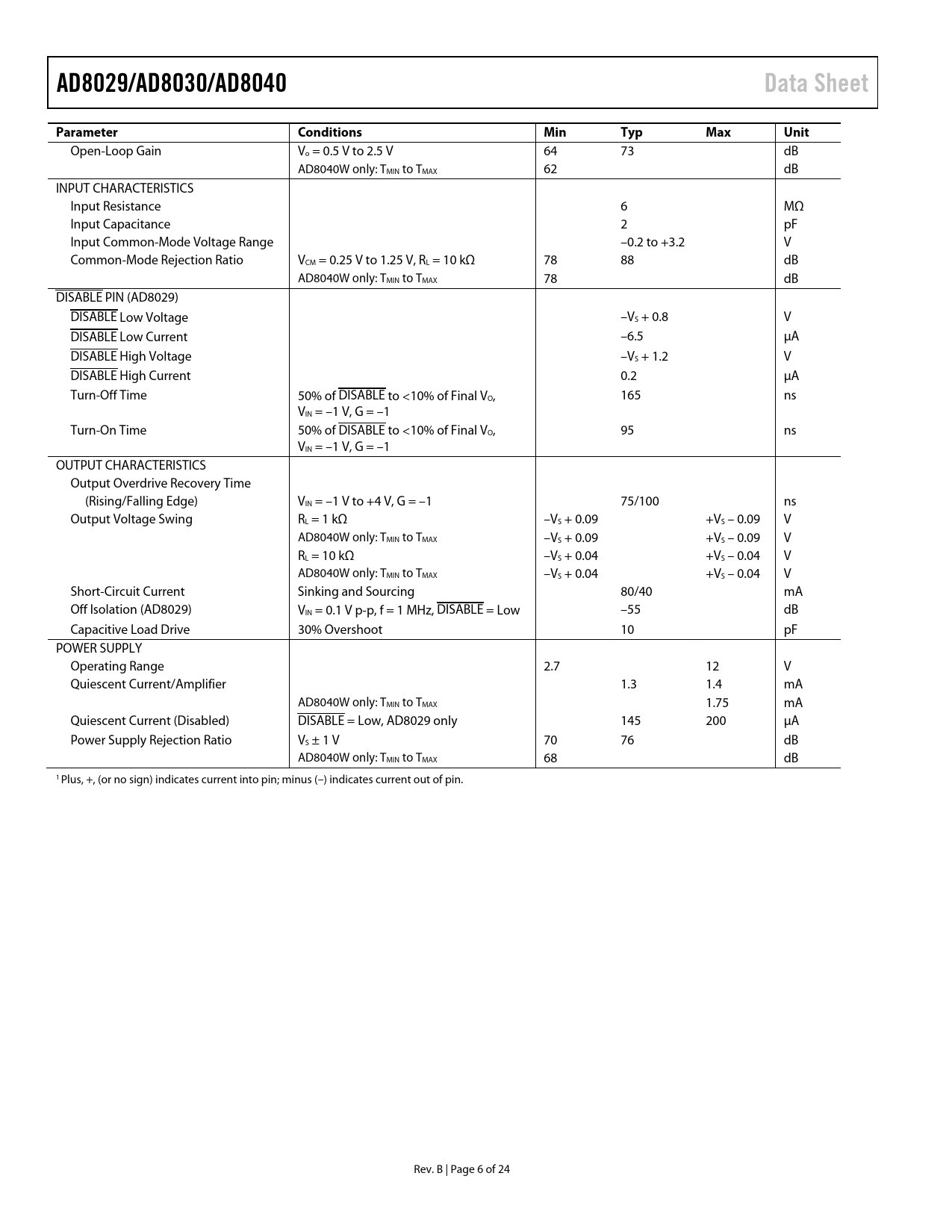 Pages / Page24 / 6 — AD8029/AD8030/AD8040. Data Sheet. Parameter. Conditions. Min. Typ. Max. …