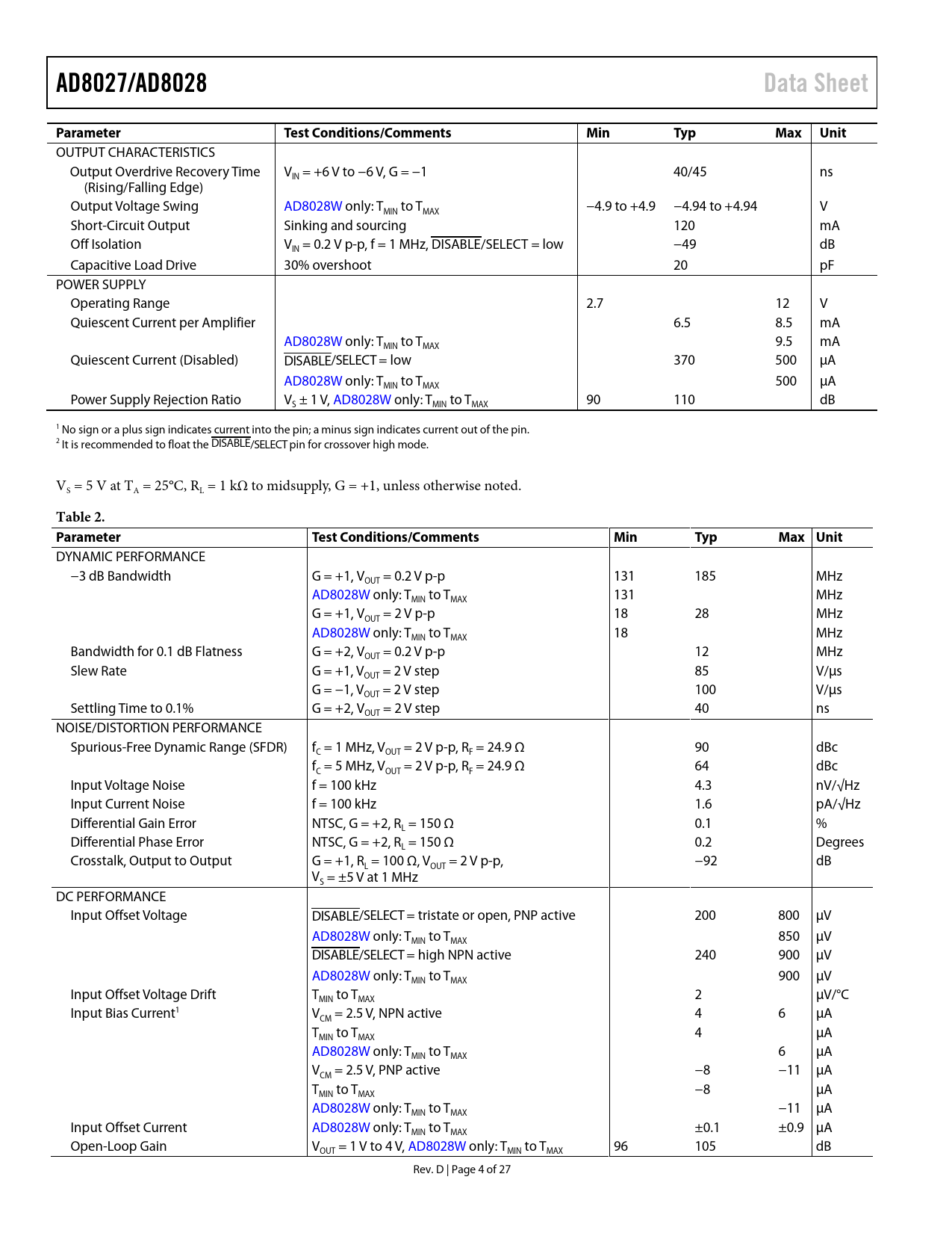 Pages / Page27 / 4 — AD8027/AD8028. Data Sheet. Parameter. Test Conditions/Comments. Min. Typ. …