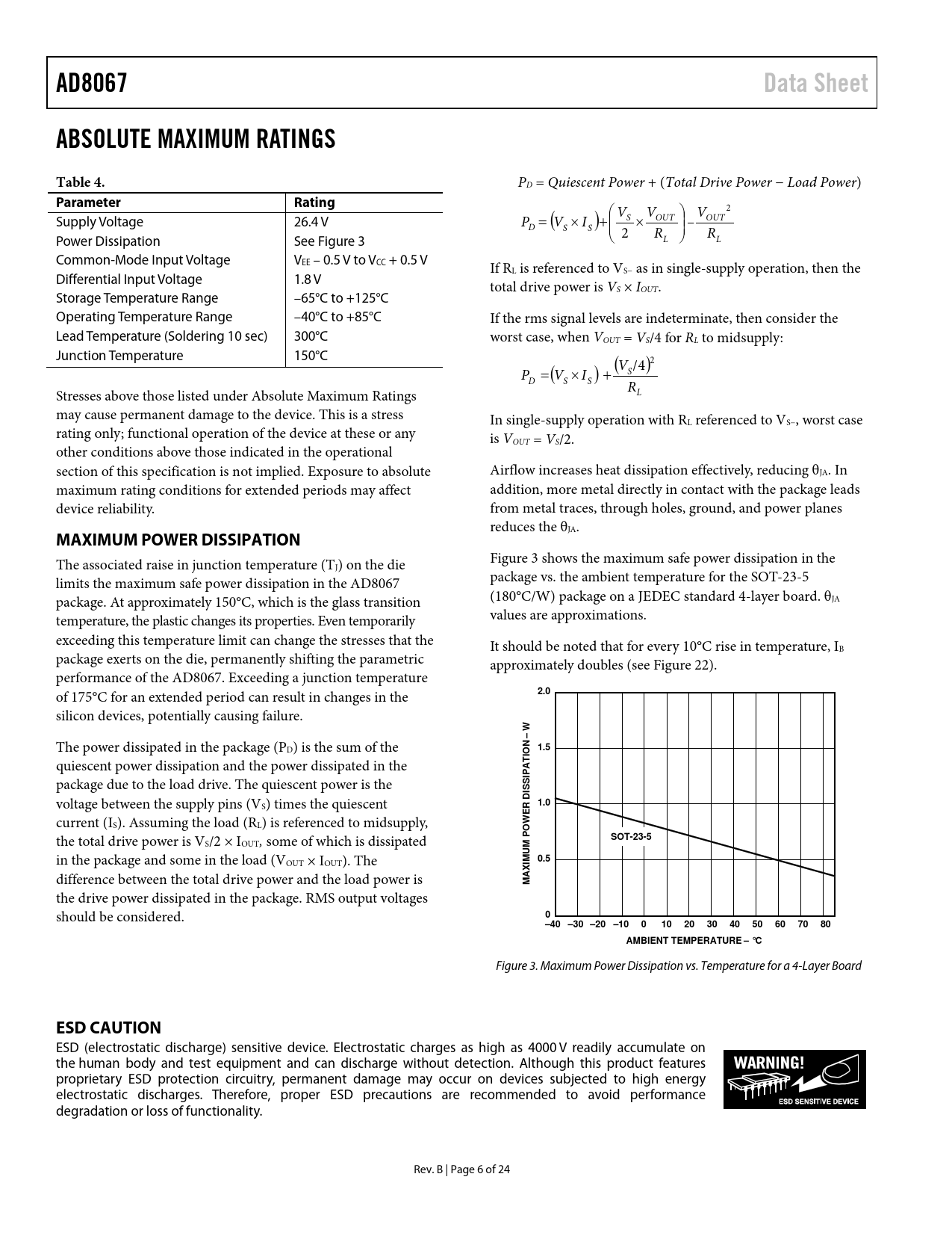 AD8067. Data Sheet. ABSOLUTE MAXIMUM RATINGS. Table 4. Parameter. Rating. MAXIMUM POWER DISSIPATION. 2.0. W –. 1.5. 1.0. SOT-23-5. 0.5