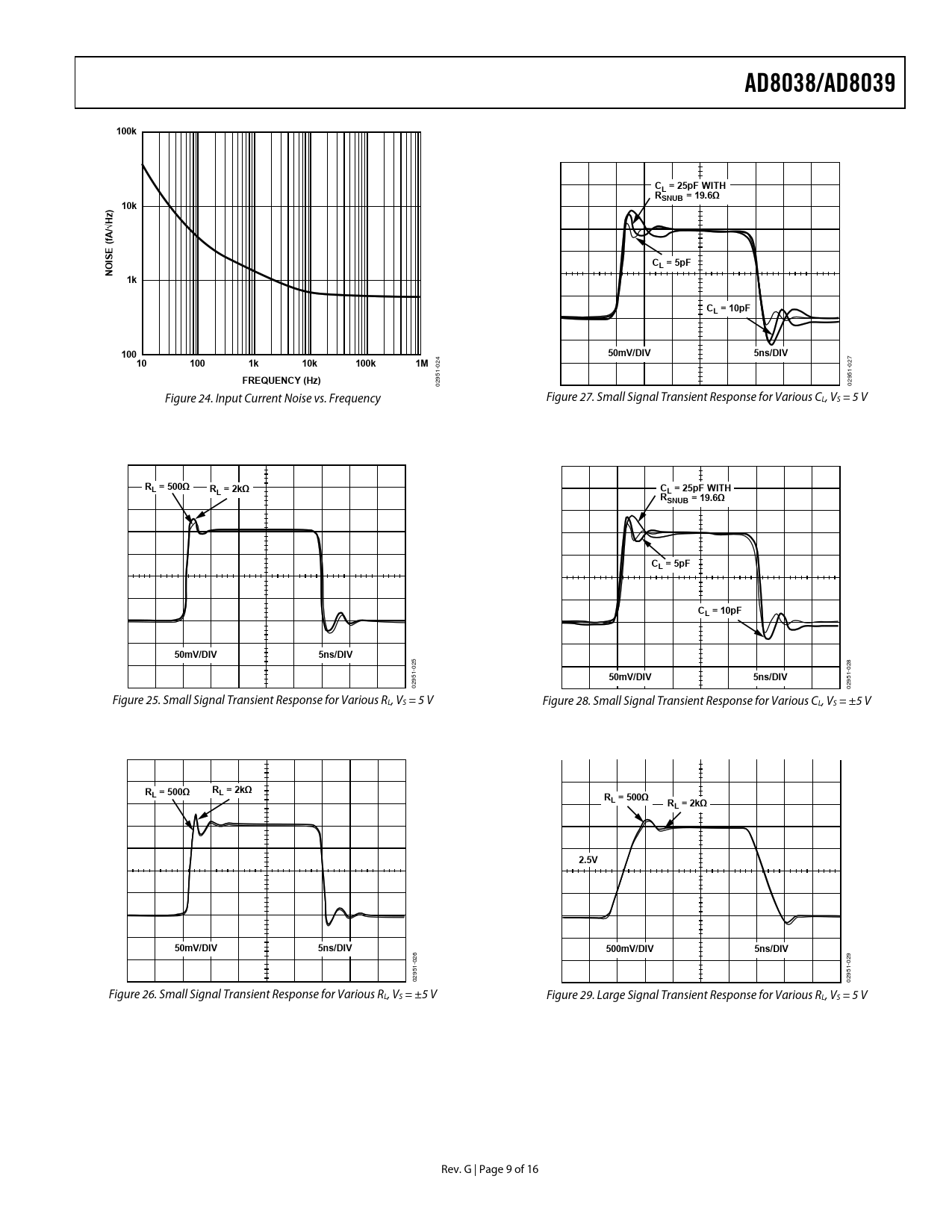 AD8038/AD8039. 100k. CL = 25pF WITH. RSNUB = 19.6Ω. ) 10k. /√Hz fA. ISE ( O. CL = 5pF. CL = 10pF. 100. 50mV/DIV. 5ns/DIV. 10k. FREQUENCY (Hz)