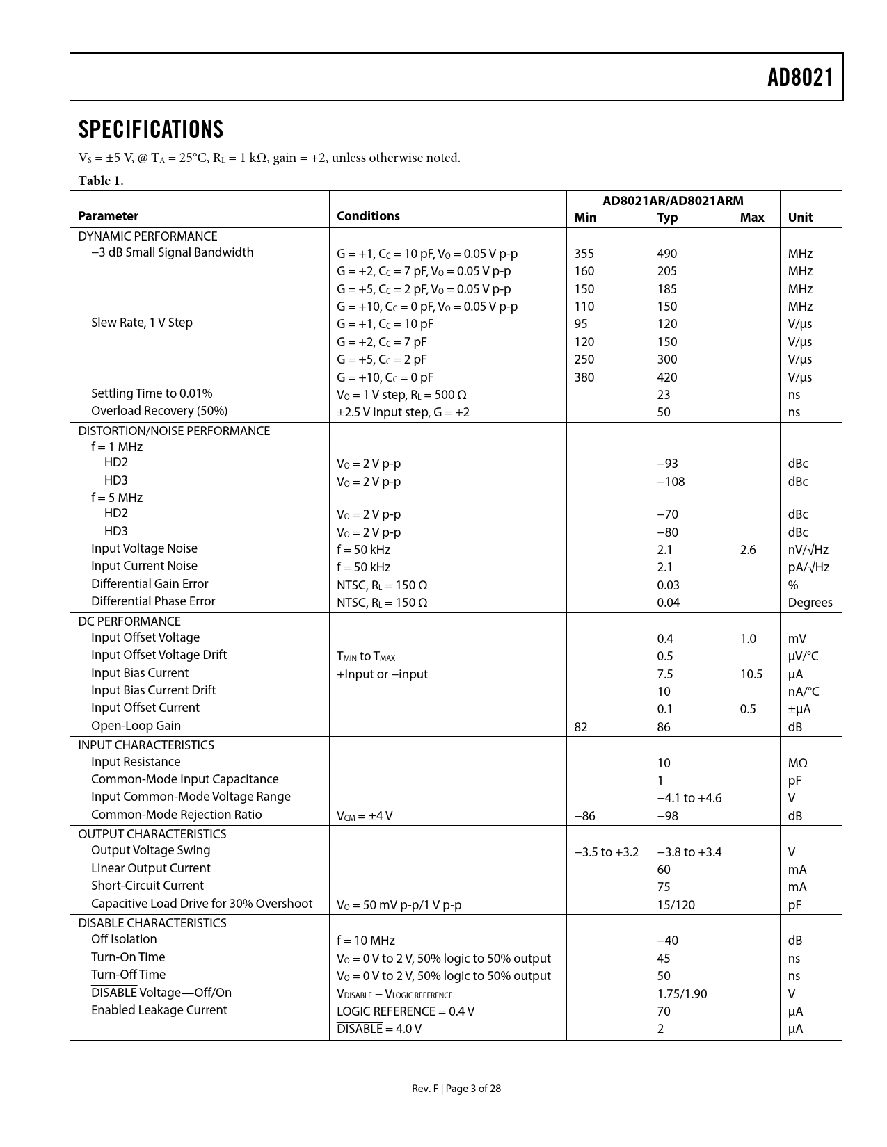 AD8021SPECIFICATIONS VS = ±5 V, @ TA = 25°C, RL = 1 kΩ, gain = +2, unless otherwise noted. Table 1.AD8021AR/AD8021ARMParameter ConditionsMinTypMaxUnit DYNAMIC PERFORMANCE −3 dB Small Signal Bandwidth G = +1, CC = 10 pF, VO = 0.05 V p-p 355 490 MHz G = +2, CC = 7 pF, VO = 0.05 V p-p 160 205 MHz G = +5, CC = 2 pF, VO = 0.05 V p-p 150 185 MHz G = +10, CC = 0 pF, VO = 0.05 V p-p 110 150 MHz Slew Rate, 1 V Step G = +1, CC = 10 pF 95 120 V/μs G = +2, CC = 7 pF 120 150 V/μs G = +5, CC = 2 pF 250 300 V/μs G = +10, CC = 0 pF 380 420 V/μs Settling Time to 0.01% VO = 1 V step, RL = 500 Ω 23 ns Overload Recovery (50%) ±2.5 V input step, G = +2 50 ns DISTORTION/NOISE PERFORMANCE f = 1 MHz HD2 VO = 2 V p-p −93 dBc HD3 VO = 2 V p-p −108 dBc f = 5 MHz HD2 VO = 2 V p-p −70 dBc HD3 VO = 2 V p-p −80 dBc Input Voltage Noise f = 50 kHz 2.1 2.6 nV/√Hz Input Current Noise f = 50 kHz 2.1 pA/√Hz Differential Gain Error NTSC, RL = 150 Ω 0.03 % Differential Phase Error NTSC, RL = 150 Ω 0.04 Degrees DC PERFORMANCE Input Offset Voltage 0.4 1.0 mV Input Offset Voltage Drift TMIN to TMAX 0.5 μV/°C Input Bias Current +Input or −input 7.5 10.5 μA Input Bias Current Drift 10 nA/°C Input Offset Current 0.1 0.5 ±μA Open-Loop Gain 82 86 dB INPUT CHARACTERISTICS Input Resistance 10 MΩ Common-Mode Input Capacitance 1 pF Input Common-Mode Voltage Range −4.1 to +4.6 V Common-Mode Rejection Ratio VCM = ±4 V −86 −98 dB OUTPUT CHARACTERISTICS Output Voltage Swing −3.5 to +3.2 −3.8 to +3.4 V Linear Output Current 60 mA Short-Circuit Current 75 mA Capacitive Load Drive for 30% Overshoot VO = 50 mV p-p/1 V p-p 15/120 pF DISABLE CHARACTERISTICS Off Isolation f = 10 MHz −40 dB Turn-On Time VO = 0 V to 2 V, 50% logic to 50% output 45 ns Turn-Off Time VO = 0 V to 2 V, 50% logic to 50% output 50 ns DISABLE Voltage—Off/On VDISABLE − VLOGIC REFERENCE 1.75/1.90 V Enabled Leakage Current LOGIC REFERENCE = 0.4 V 70 μA DISABLE = 4.0 V 2 μA Rev. F | Page 3 of 28 Document Outline FEATURES APPLICATIONS GENERAL DESCRIPTION CONNECTION DIAGRAM TABLE OF CONTENTS REVISION HISTORY SPECIFICATIONS ABSOLUTE MAXIMUM RATINGS MAXIMUM POWER DISSIPATION ESD CAUTION PIN CONFIGURATION AND FUNCTION DESCRIPTIONS TYPICAL PERFORMANCE CHARACTERISTICS TEST CIRCUITS APPLICATIONS USING THE DISABLE FEATURE THEORY OF OPERATION PCB LAYOUT CONSIDERATIONS DRIVING 16-BIT ADCs DIFFERENTIAL DRIVER USING THE AD8021 IN ACTIVE FILTERS DRIVING CAPACITIVE LOADS OUTLINE DIMENSIONS ORDERING GUIDE