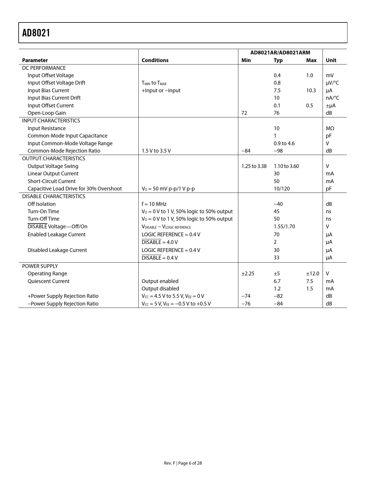 AD8021AD8021AR/AD8021ARMParameterConditionsMinTypMaxUnit DC PERFORMANCE Input Offset Voltage 0.4 1.0 mV Input Offset Voltage Drift TMIN to TMAX 0.8 μV/°C Input Bias Current +Input or −input 7.5 10.3 μA Input Bias Current Drift 10 nA/°C Input Offset Current 0.1 0.5 ±μA Open-Loop Gain 72 76 dB INPUT CHARACTERISTICS Input Resistance 10 MΩ Common-Mode Input Capacitance 1 pF Input Common-Mode Voltage Range 0.9 to 4.6 V Common-Mode Rejection Ratio 1.5 V to 3.5 V −84 −98 dB OUTPUT CHARACTERISTICS Output Voltage Swing 1.25 to 3.38 1.10 to 3.60 V Linear Output Current 30 mA Short-Circuit Current 50 mA Capacitive Load Drive for 30% Overshoot VO = 50 mV p-p/1 V p-p 10/120 pF DISABLE CHARACTERISTICS Off Isolation f = 10 MHz −40 dB Turn-On Time VO = 0 V to 1 V, 50% logic to 50% output 45 ns Turn-Off Time VO = 0 V to 1 V, 50% logic to 50% output 50 ns DISABLE Voltage—Off/On VDISABLE − VLOGIC REFERENCE 1.55/1.70 V Enabled Leakage Current LOGIC REFERENCE = 0.4 V 70 μA DISABLE = 4.0 V 2 μA Disabled Leakage Current LOGIC REFERENCE = 0.4 V 30 μA DISABLE = 0.4 V 33 μA POWER SUPPLY Operating Range ±2.25 ±5 ±12.0 V Quiescent Current Output enabled 6.7 7.5 mA Output disabled 1.2 1.5 mA +Power Supply Rejection Ratio VCC = 4.5 V to 5.5 V, VEE = 0 V −74 −82 dB −Power Supply Rejection Ratio VCC = 5 V, VEE = −0.5 V to +0.5 V −76 −84 dB Rev. F | Page 6 of 28 Document Outline FEATURES APPLICATIONS GENERAL DESCRIPTION CONNECTION DIAGRAM TABLE OF CONTENTS REVISION HISTORY SPECIFICATIONS ABSOLUTE MAXIMUM RATINGS MAXIMUM POWER DISSIPATION ESD CAUTION PIN CONFIGURATION AND FUNCTION DESCRIPTIONS TYPICAL PERFORMANCE CHARACTERISTICS TEST CIRCUITS APPLICATIONS USING THE DISABLE FEATURE THEORY OF OPERATION PCB LAYOUT CONSIDERATIONS DRIVING 16-BIT ADCs DIFFERENTIAL DRIVER USING THE AD8021 IN ACTIVE FILTERS DRIVING CAPACITIVE LOADS OUTLINE DIMENSIONS ORDERING GUIDE