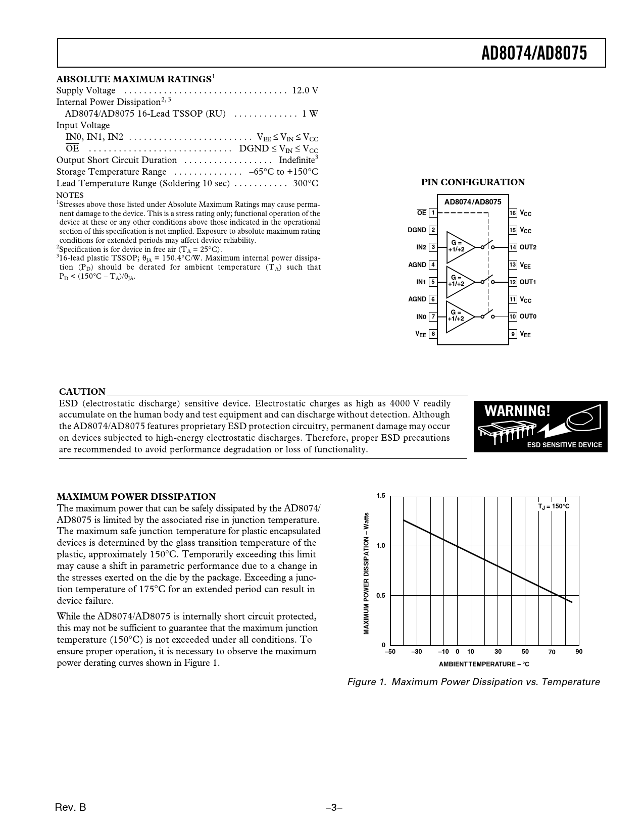Supply Voltage . 12.0 V Internal Power Dissipation2, 3 AD8074/AD8075 16-Lead TSSOP (RU) . 1 W Input Voltage IN0, IN1, IN2 . VEE ≤ VIN ≤ VCC OE . DGND ≤ VIN ≤ VCC Output Short Circuit Duration . Indefinite3 Storage Temperature Range . –65°C to +150°C Lead Temperature Range (Soldering 10 sec) . 300°C
