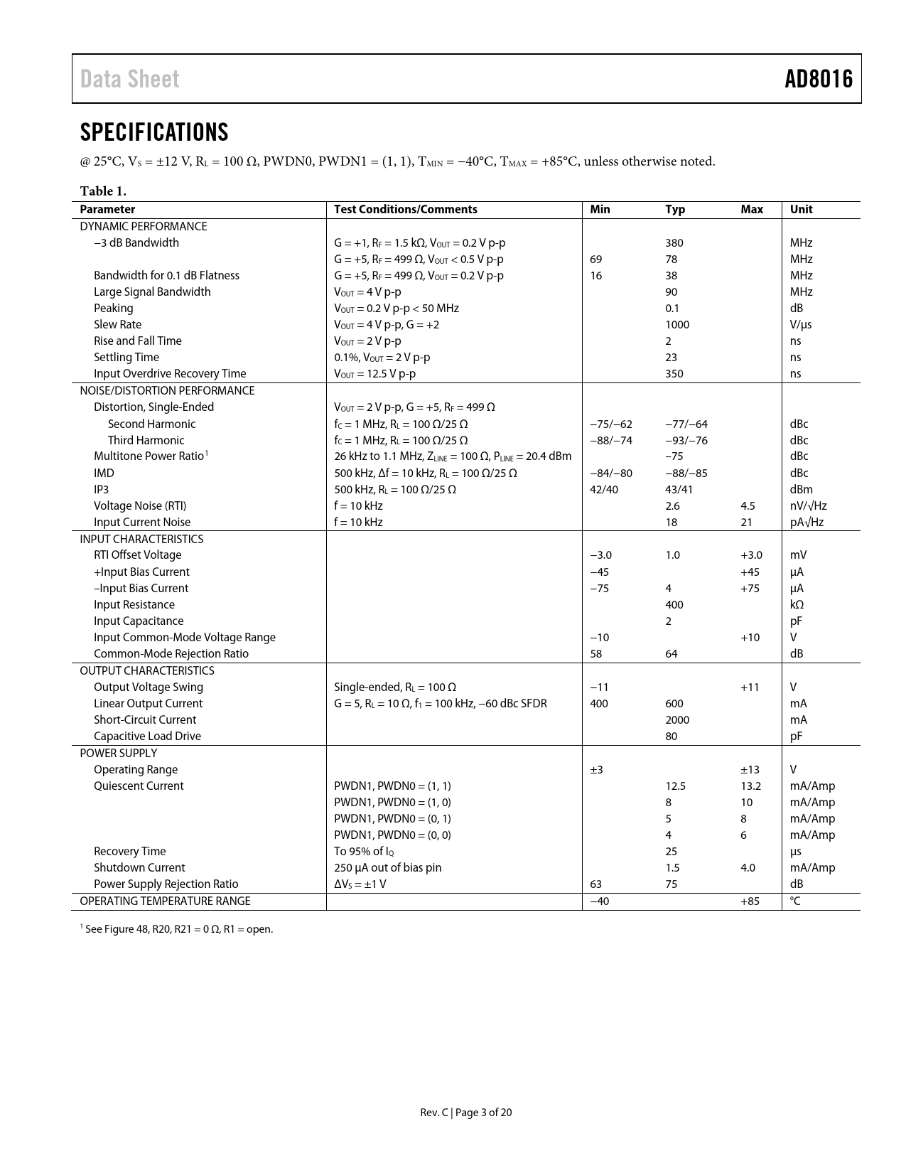 Data Sheet. AD8016. SPECIFICATIONS. Table 1. Parameter. Test Conditions/Comments. Min. Typ. Max. Unit